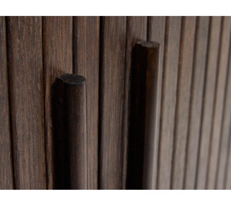 Skrinka je vyhotovená z kombinácie dubovej dyhy a MDF, pričom povrchová úprava zvýrazňuje pravidelnú estetickú kresbu letokruhov. Tmavé hnedé prírodné prevedenie dodáva nábytku autentický charakter a elegantný vzhľad.