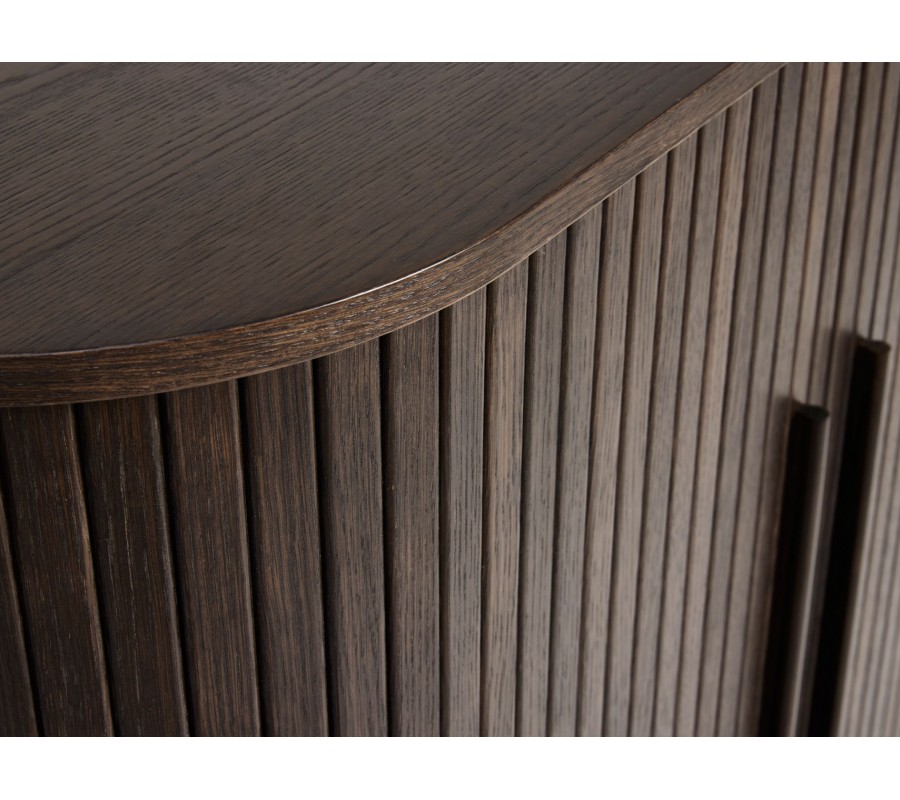 Skrinka vás na prvý pohľad upúta svojou oválnou siluetou s hladkou vrchnou doskou. Retro vzhľad podčiarkujú posuvné dvierka vykladané vertikálnymi lamelami. Dopĺňajú ich jednoduché valcovité úchytky, ktoré ladia s celkovým minimalistickým dizajnom a vizuálne nadväzujú na vyššie nožičky. Tie sú smerom nadol mierne zúžené, čo pôsobí ľahko a elegantne, pričom ich horná časť je spevnená obdĺžnikovým rámom pre maximálnu stabilitu.