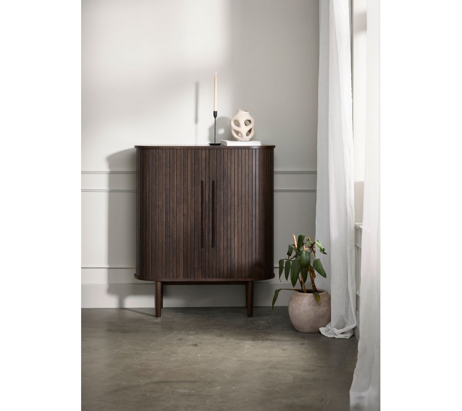 Barová skrinka Alborg predstavuje štýlové spojenie škandinávskeho štýlu a retro estetiky. Tmavé drevo pôsobí sofistikovane a zároveň prinesie do vašej jedálne či obývačky typický hrejivý severský vizuál.