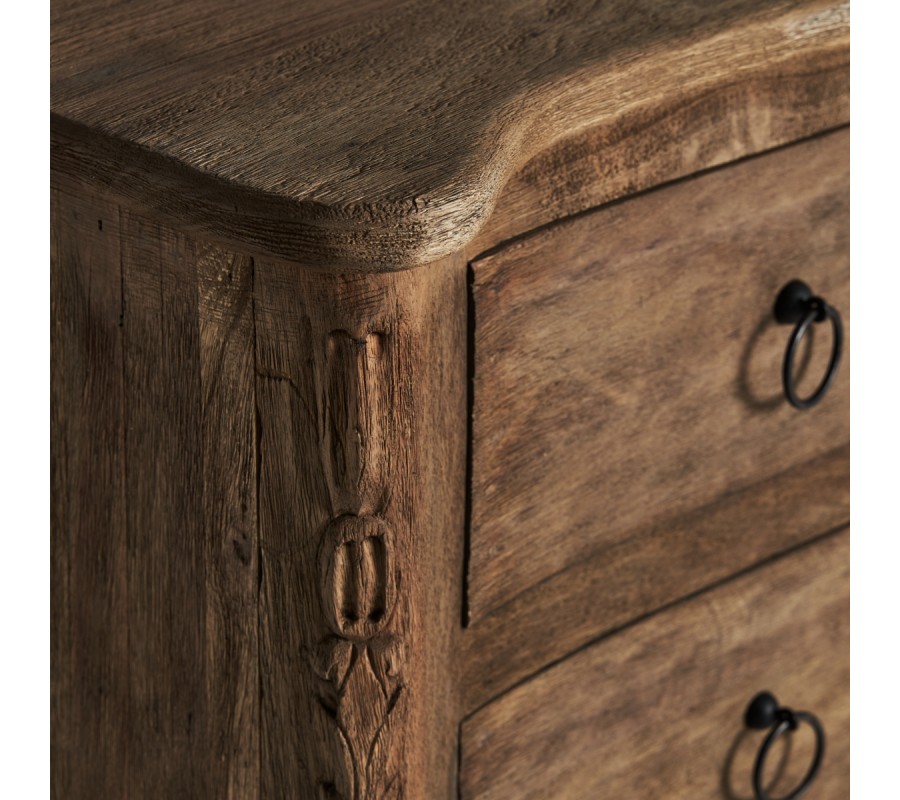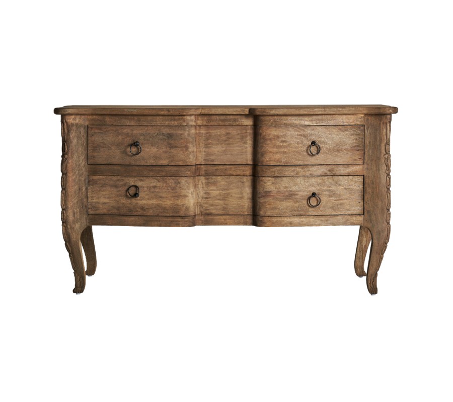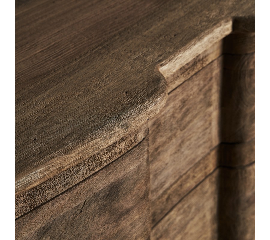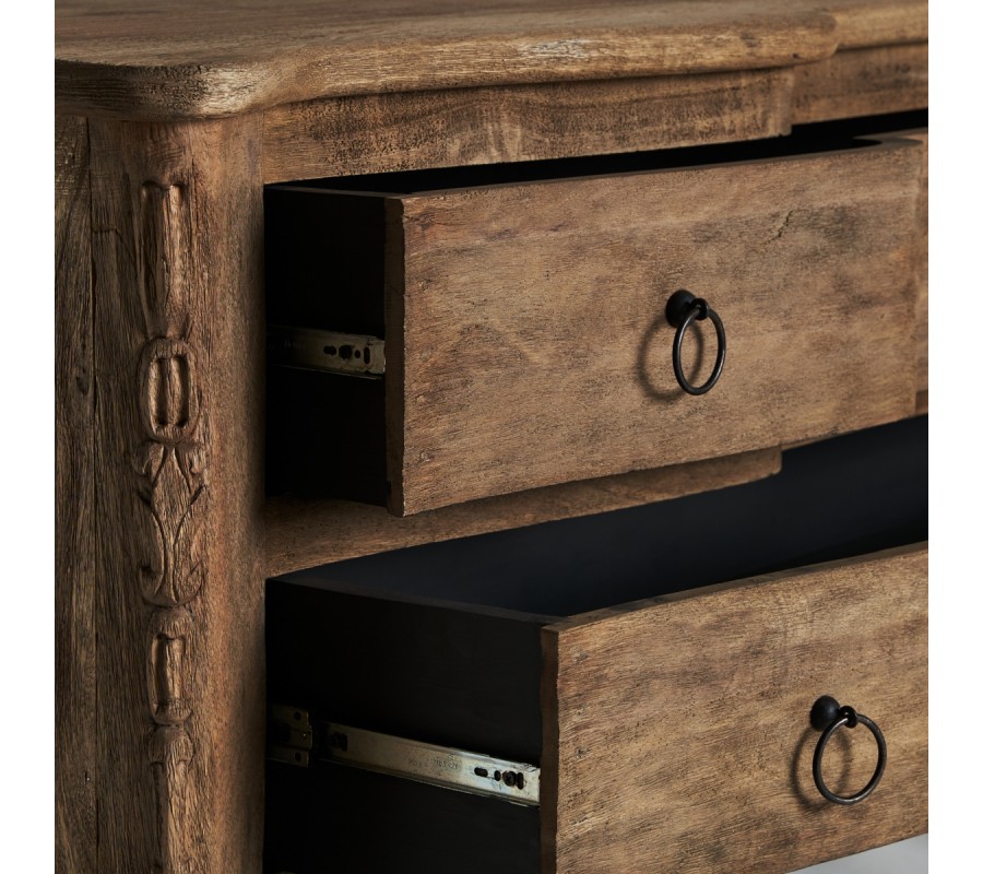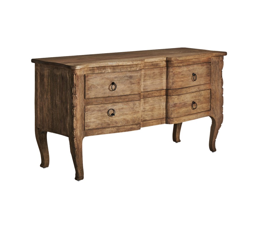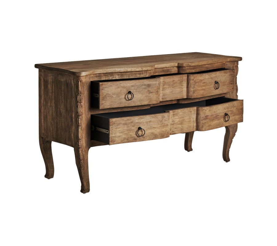 Luxusný vidiecky príborník je vyrobený z kvalitného mangového masívu. Príborník Munguia určite poslúži aj ako komoda do predsiene, spálne alebo obývačky vďaka jeho dvom priestranným zásuvkám. Na prvý pohľad si môžete všimnúť krásne ručné vyrezávanie na nožičkách a na predných hranách, ktoré umocňujú rustikálny vzhľad príborníku. K tomuto efektu prispieva aj viditeľná štruktúra dreva a dobovo pôsobiace okrúhle kovové rukoväte
