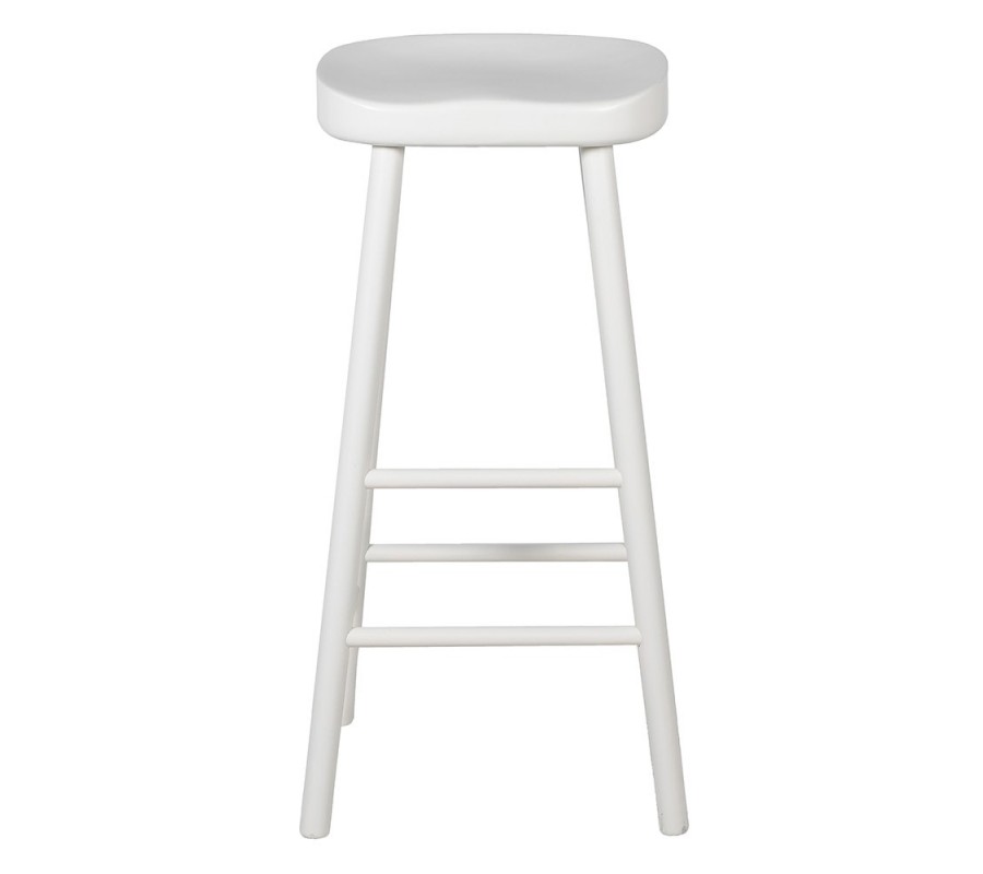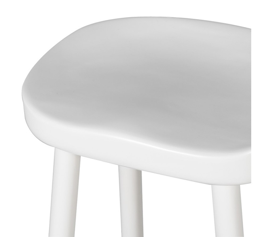 Barová stolička má jednoduchý a čistý dizajn s hladkým bielym povrchom. Konštrukcia je pevná, pozostáva zo štyroch zúžených nôh prepojených priečkami, ktoré slúžia ako opierka na nohy. Tvar sedadla je mierne zaoblený a ergonomicky prispôsobený, pričom chýbajú opierky na ruky alebo chrbát, čo zdôrazňuje minimalizmus dizajnu.