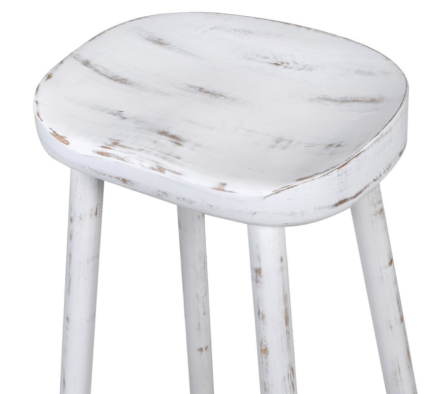 Barová stolička je ladená v bielej farbe s výraznou povrchovou úpravou, ktorá pripomína vintage alebo rustikálny štýl. Povrch má jemné známky opotrebovania, ktoré vytvárajú patinu a dodávajú stoličke charakter. Konštrukcia je pevná, vyrobená z dubového dreva, a obsahuje štyri rovnomerne rozmiestnené nohy, ktoré sú spojené priečkami, čo zabezpečuje stabilitu a zároveň slúži ako opora na nohy.