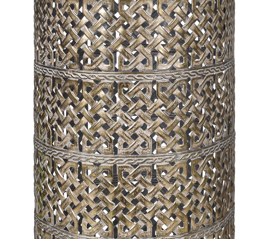 Stojan je vyrobený z kovu v zlatej farbe. Povrch je upravený efektom zámerného zostarnutia, ktorý zdôrazňuje bohatý reliéf vzorov a zároveň dodáva tomuto doplnku štýlový vintage vzhľad.