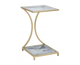 Art deco príručný stolík Aurelio so zlatou kovovou konštrukciou a obdĺžnikovými sklenenými doskami s mramorovým dizajnom 60 cm