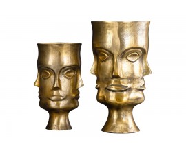 Glamour set kovových okrúhlych zlatých kvetináčov na kvety Zena v podobe tvárí s jemnou patinou s vintage nádychom 38 cm