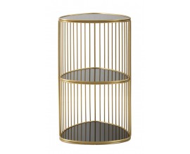 Art deco príručný stolík Celestia s okrúhlou vrchnou doskou zo zrkadlového skla a tromi policami so zlatou konštrukciou 86 cm