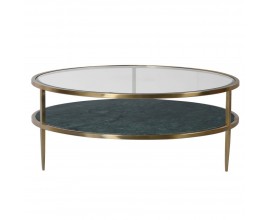 Dizajnový art deco okrúhly príručný stolík Rhonie so kovovým rámom v zlatej farbe a priehľadnou sklenenou doskou 74 cm