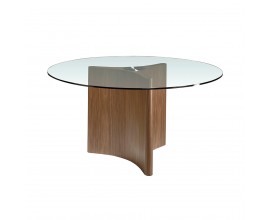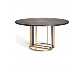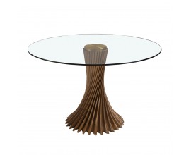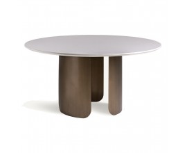 Luxusný art deco okrúhly jedálenský stôl Gatsby s bielou mramorovou doskou a hnedou masívnou nohou s drážkovaným reliéfom 140 cm