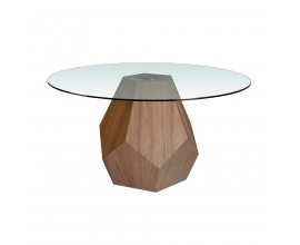 Luxusný moderný sklenený trojuholníkový konferenčný stolík Vita Naturale s policou z hnedého orechového dreva 135 cm