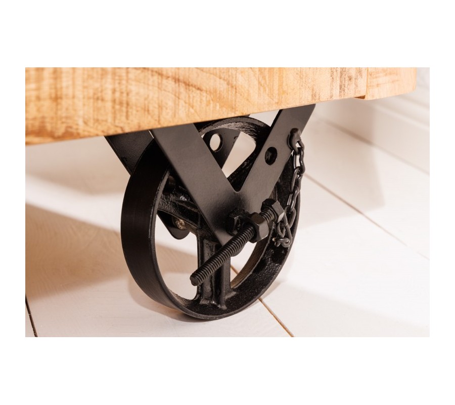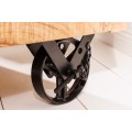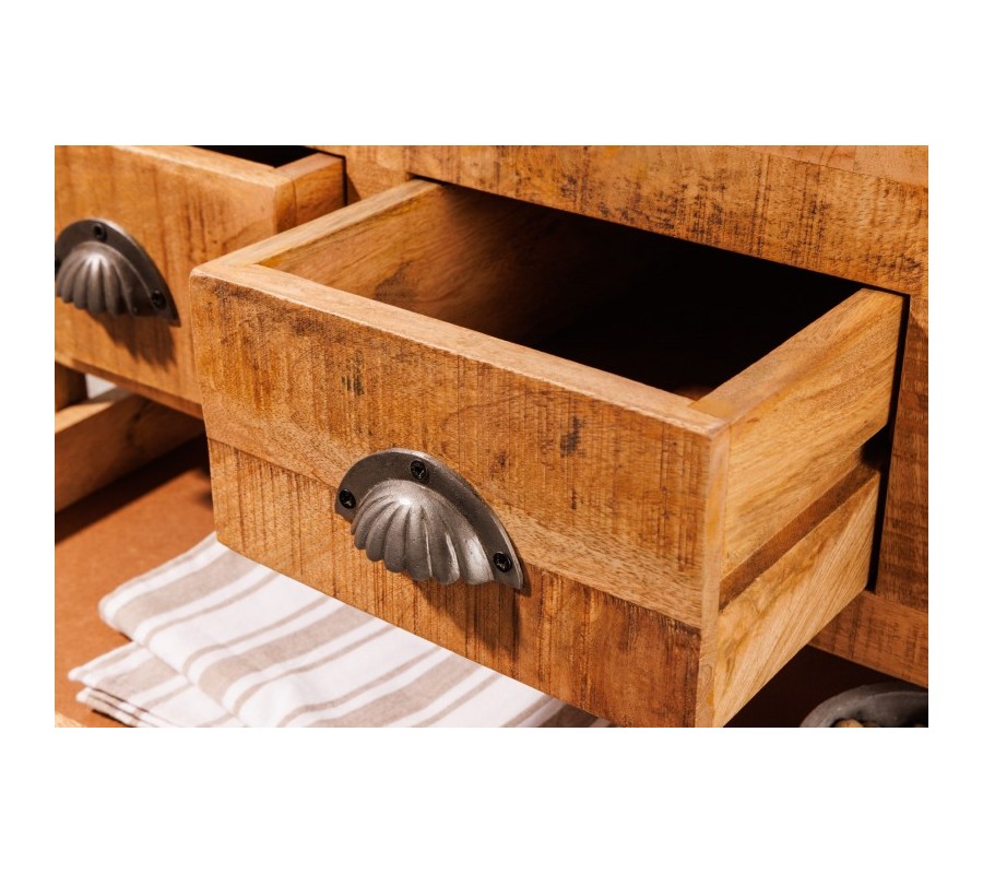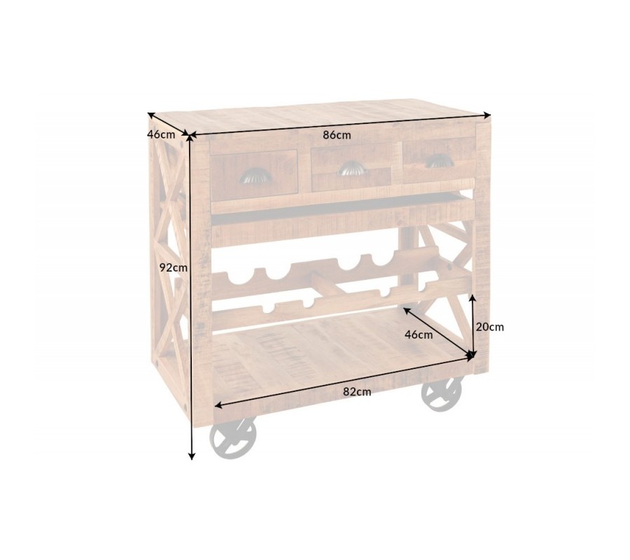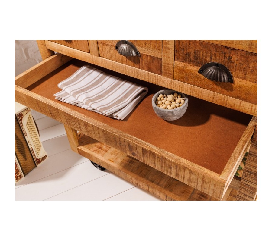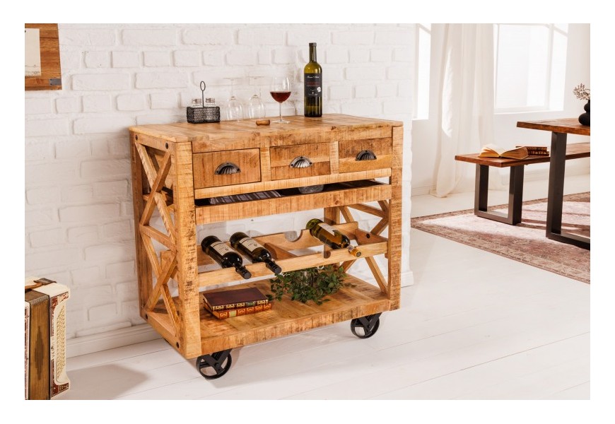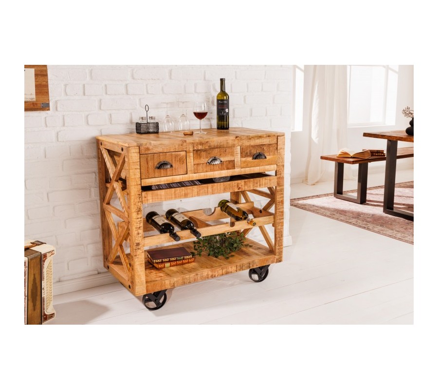 Dizajnový barový vozík Cahone vkusne a prakticky doplní priestory moderne či industriálne ladených jedální alebo obývačiek. Svojím naturálnym vzhľadom vkusne doplní vašu miestnoť a vnesie do nej štýlový naturálny nádych. Tento kúsok si zamiilujú predovšetkým tí, ktorí obľubujú kvalitné a zároveň dizajnovo pútavé kúsky. Skrinka je vyrobená z masívneho mangového dreva a jej povrchová úprava sa nesie v prírodnej svetlohnedej farbe. Teplá farebnosť spríjemní vaše priestory a pomôže v nich vytvoriť skutočne útulnú atmosféru domova. K tomu tiež prispieva viditeľná kresba dreva vnášajúca do každého priestoru nezameniteľný nádych prírody. Vozík disponuje praktickými zásuvkami a poličkou so špeciálnymi výrezmi na uskladnenie vínových fliaš. Praktickým prvkom sú taktiež dizajnové čierne kolieska, ktoré výrazne uľahčujú manipuláciu. Okrem toho koliečka dodávajú skrinke nádych industriálneho štýlu, ktorý umocňujú aj dizajnové kovové rukoväte. Skrinka Cahone tak prepája dizajnový vzhľad s praktickým účelom a vďaka bohatému úložnému priestoru sa stane neoddeliteľnou súčasťou vašich barových priestorov!