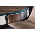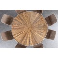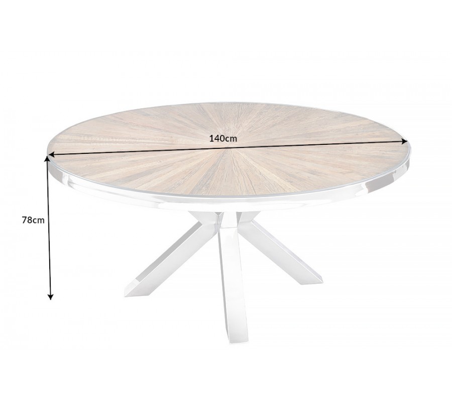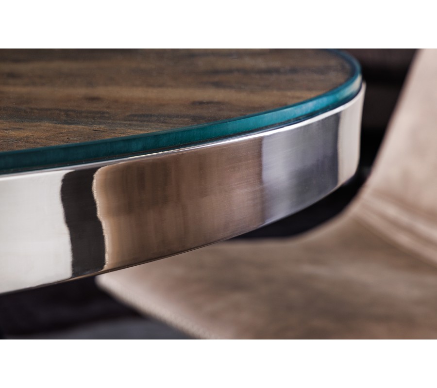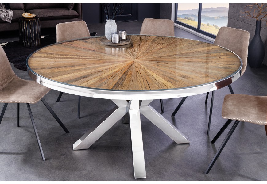 Industriálny okrúhly jedálenský stôl s chromovanými striebornými nožičkami a drevenou doskou s povrchom zo skla znie naozaj impozantne. Jeho moderný a industriálny vzhľad spolu s ochranou a elegantným dotykom skla robia z tohto stola výnimočný kus nábytku pre váš jedálenský priestor. Horná doska má zámerne ponechanú štruktúru dreva na jej povrchu a je tvarovaná z menších dosiek tak ,že letokruhy dreva spolu s rezbou dosiek vytváraju dojem lúčov vychádzajúcich zo stredu stola.