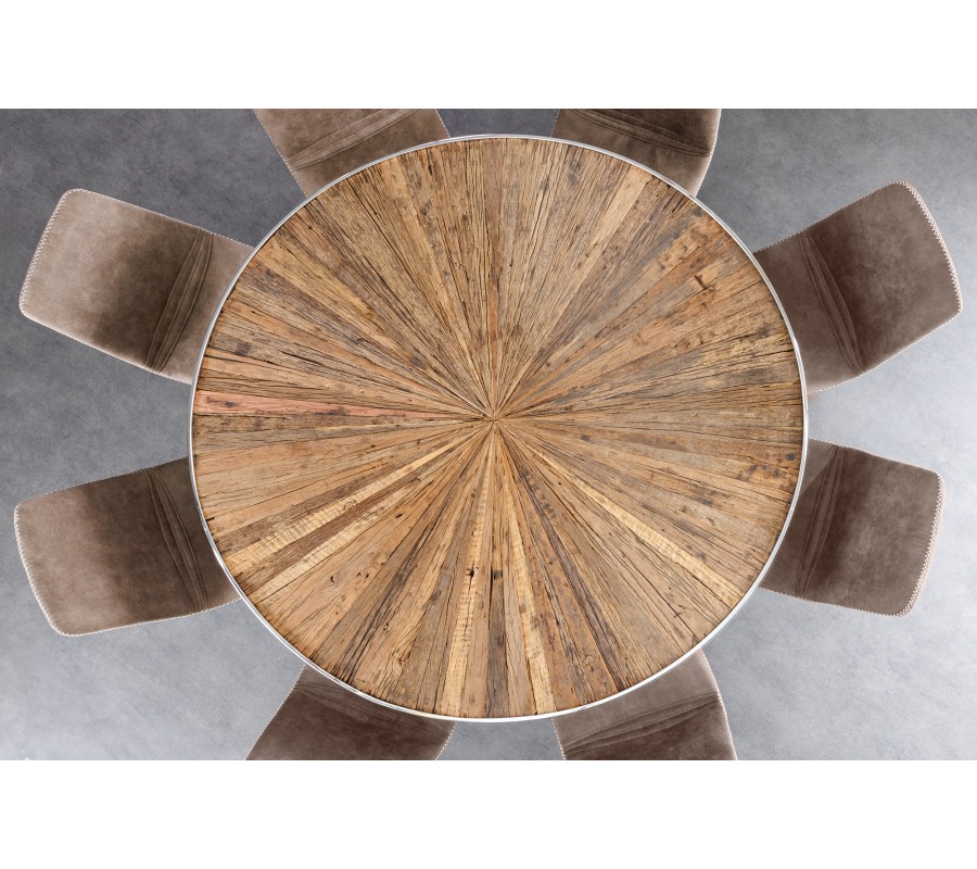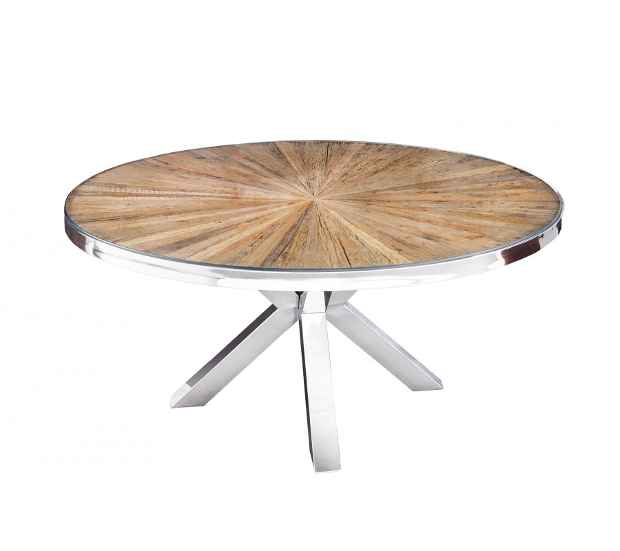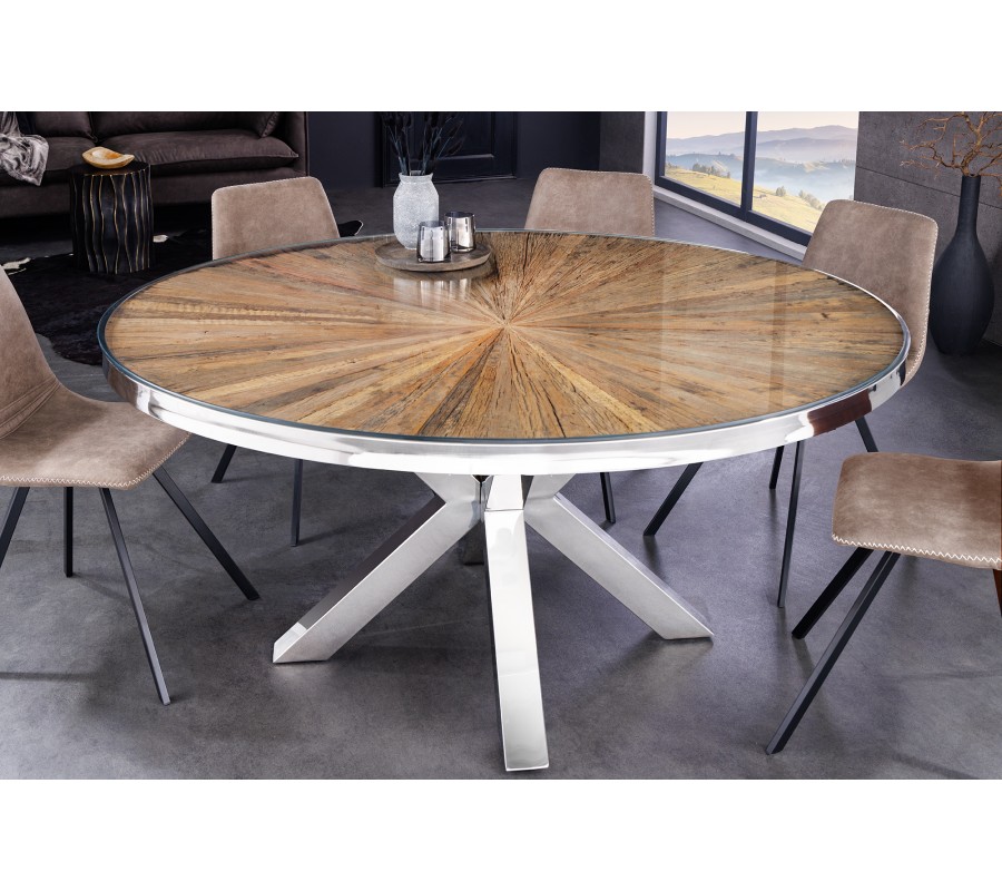 Luxusný industriálny okrúhly jedálenský stôl Barracuda z teakového hnedého dreva s chromovanými nožičkami 140 cm