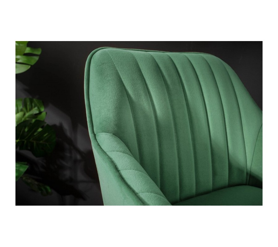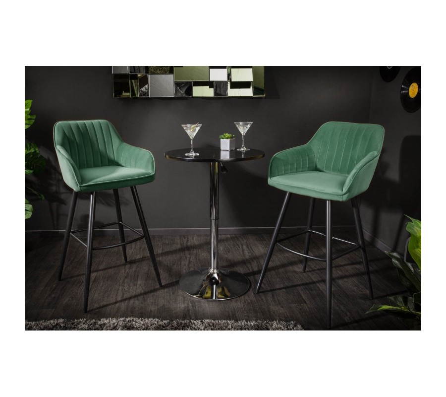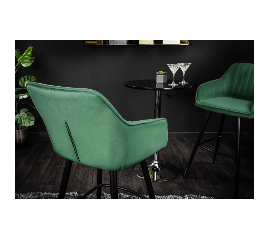 Dizajnová barová stolička Vittel je elegantným kúskom, ktorý zaujme všetkých milovníkov moderného dizajnu. Jej čalúnenie sa nesie v smaragdovozelenej farbe, ktorá vytvára štýlový súlad s čiernymi kovovými nohami. Príjemný zamatový materiál sa postará o váš komfort a k dokonalému pohodliu dopomôže aj tvarované operadlo a podrúčky. Tento nadčasový dizajn krásne vynikne v tmavých priestoroch, kde bude dominovať a vytvorí kontrastný prvok. Kombináciou s luxusným kovovým či skleneným zrkadlovým nábytkom vytvoríte dizajnový moderný efekt, ktorý zaručene učaruje vám i vašim návštevníkom.