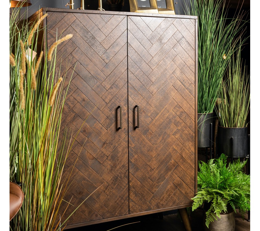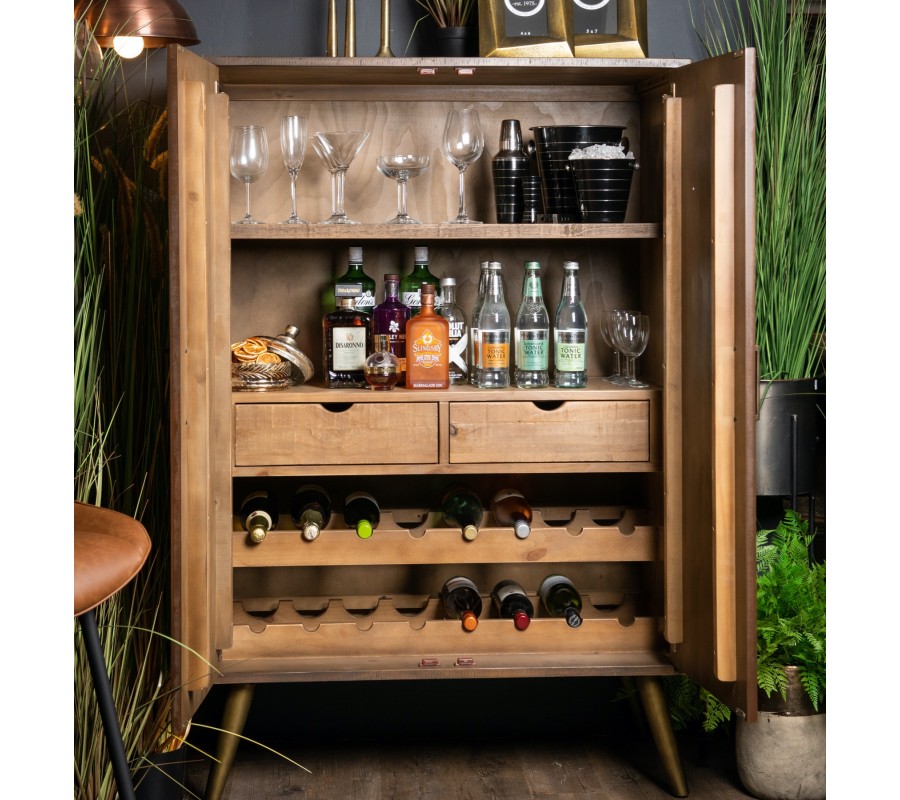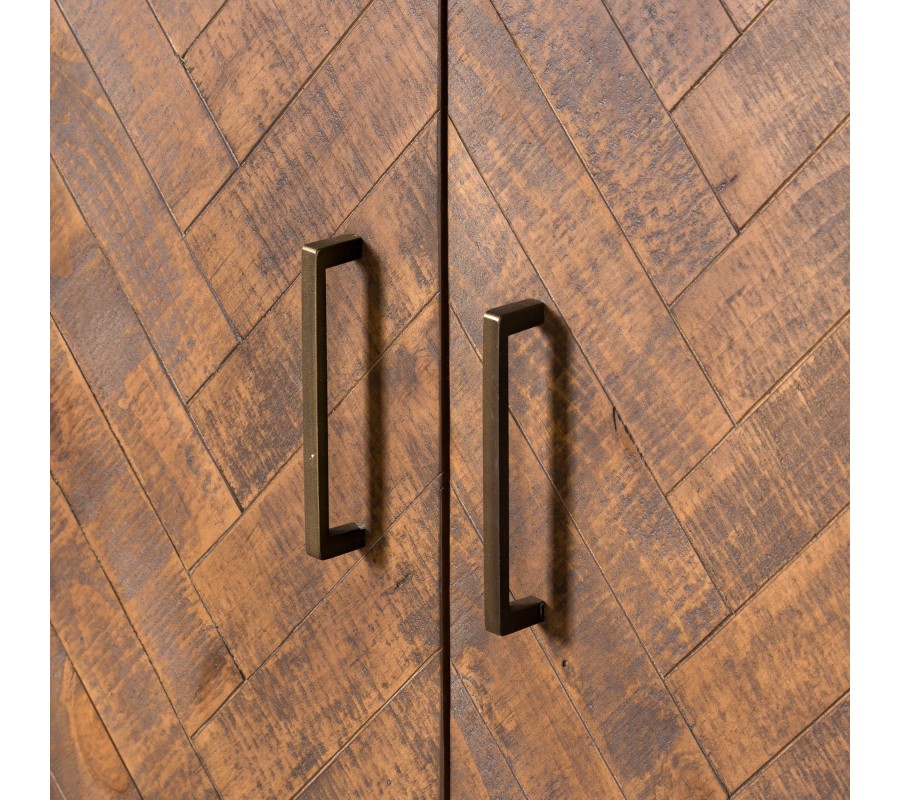 Jedinečná barová skrinka z našej kolekcie Havana Oro je kúskom nesúcim sa v retro štýle. Konštrukcia z kvalitného masívneho dreva je špecifická svojím parketovým vzorom a prirodzenou kresbou dreva, ktorá dodáva skrinke jemný rustikálny nádych. Vo vnútri sa nachádza úložný priestor s praktickými poličkami, zásuvkami a priestorom na uskladnenie fliaš. Celkový dizajn je dotvorený šikmými zlatými nožičkami, ktoré sú špecifickým znakom retro štýlu a rukoväťami na dvierkach, ktoré vytvárajú moderný sofistikovaný dojem. Barová skrinka Havana Oro krásne vynikne v priestranných jedálňach či obývačkách ladených v retro alebo art-deco štýle. Odporúčame ju doladiť orientálnymi dekoráciami v zlatých odtieňoch, prípadne doporučujeme aj ďalšie kúsky z našej kolekcie Havana Oro.