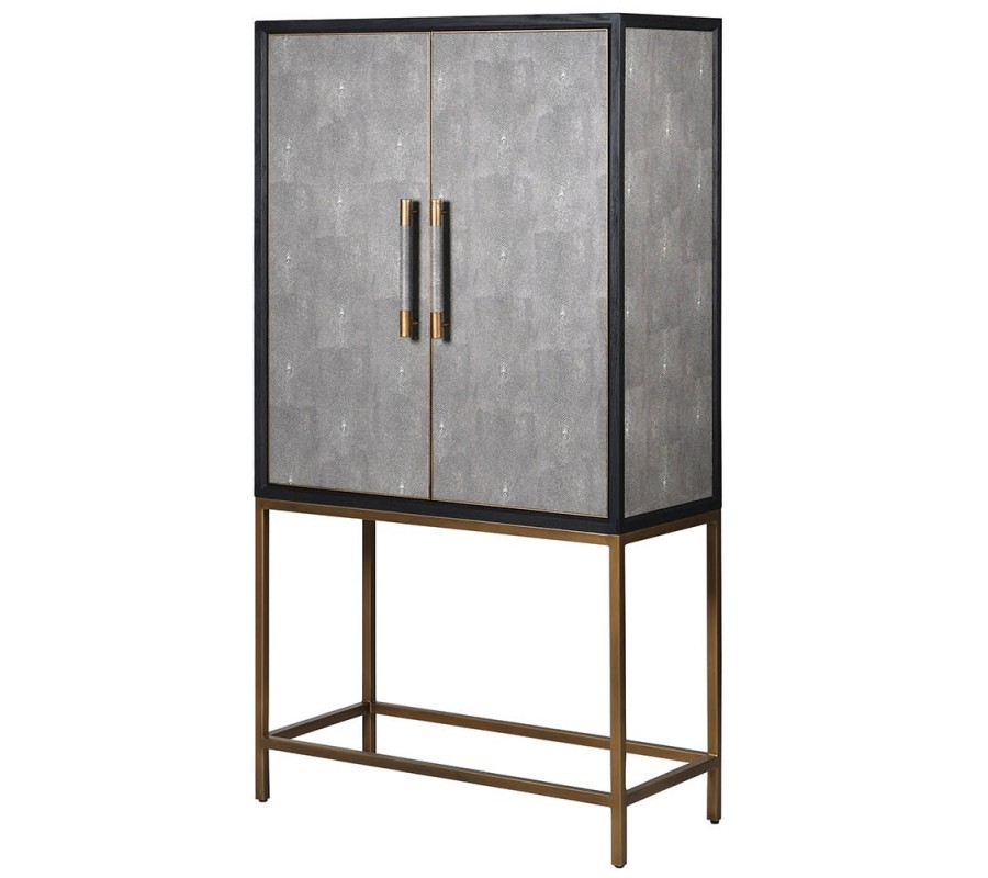 Art-Deco barová skrinka OTAWA s čalúnením zo sivej kože a s nožičkami vo vintage zlatej 182cm