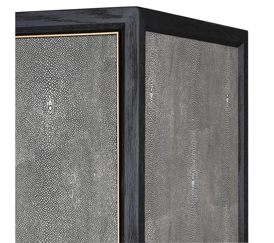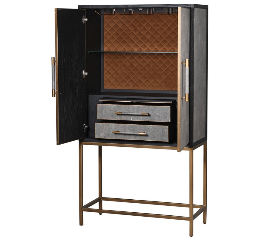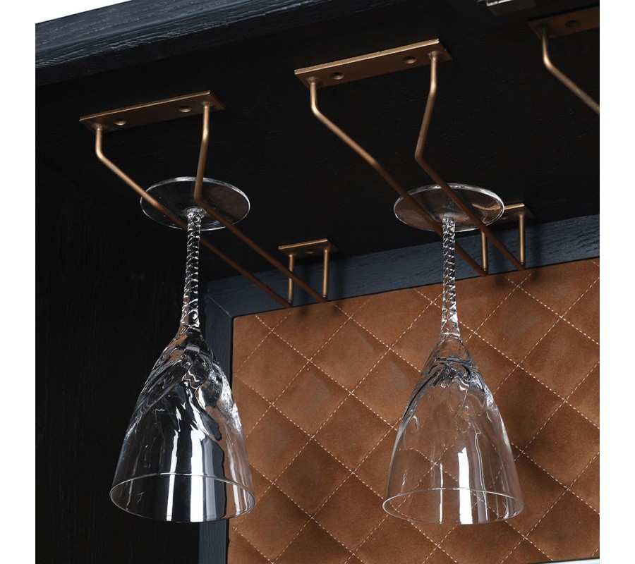 Luxusná barová skrinka z našej art-deco kolekcie Otawa jednoznačne už na prvý pohľad zaujme originálnou kombináciou kvalitného dubového dreva, čalúnenia z eko-kože a kovových prvkov. Barová skrinka je opticky rozdelená na dve časti - kovovú podstavu so štyrmi nožičkami vo vintage zlatej farbe a dvojdverovú skrinku z dubového masívu s čiernou povrchovou úpravou. Vrchná doska a dvierka, spolu s oboma bočnými a aj zadnou stranou skrinky sú zdobené surovou eko-kožou v sivej farbe, nepokrývajúc však celý povrch skrinky, nechávajúc tak priestor vyniknúť čiernej farbe dubového masívu. Celkový dizajn je doplnený kovovými detailmi vo vintage zlatej, v podobe úchytiek a lemovania dvierok, korešpondujúc tak s nožičkami. Po otvorení barovej skrinky Otawa sa Vám naskytuje pohľad na nádherné vnútorné zamatové čalúnenie v medenej farbe a množstvo úložného priestoru v podobe držiakov na poháre, poličky, dvoch zásuviek a servírovacej dosky. Barovú skrinku odporúčame kombinovať s ďalším nábytkom z našej kolekcie Otawa.