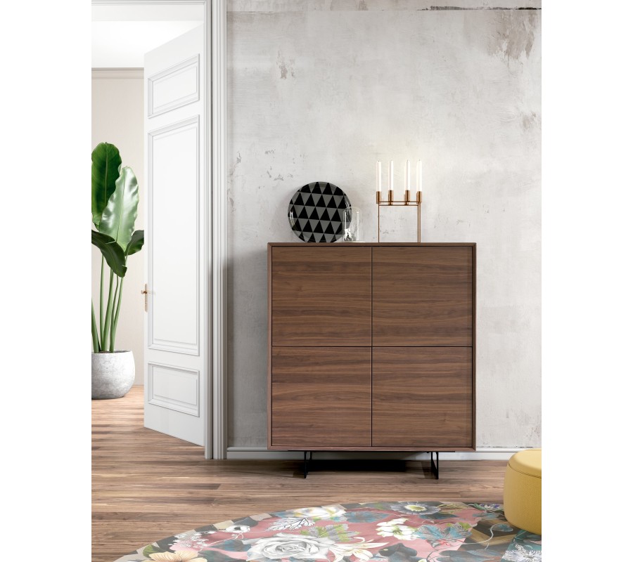 Moderná štvorcová barová skrinka Chrysler v hnedej farbe so štyrmi dvierkami a čiernymi kovovými nožičkami 125cm