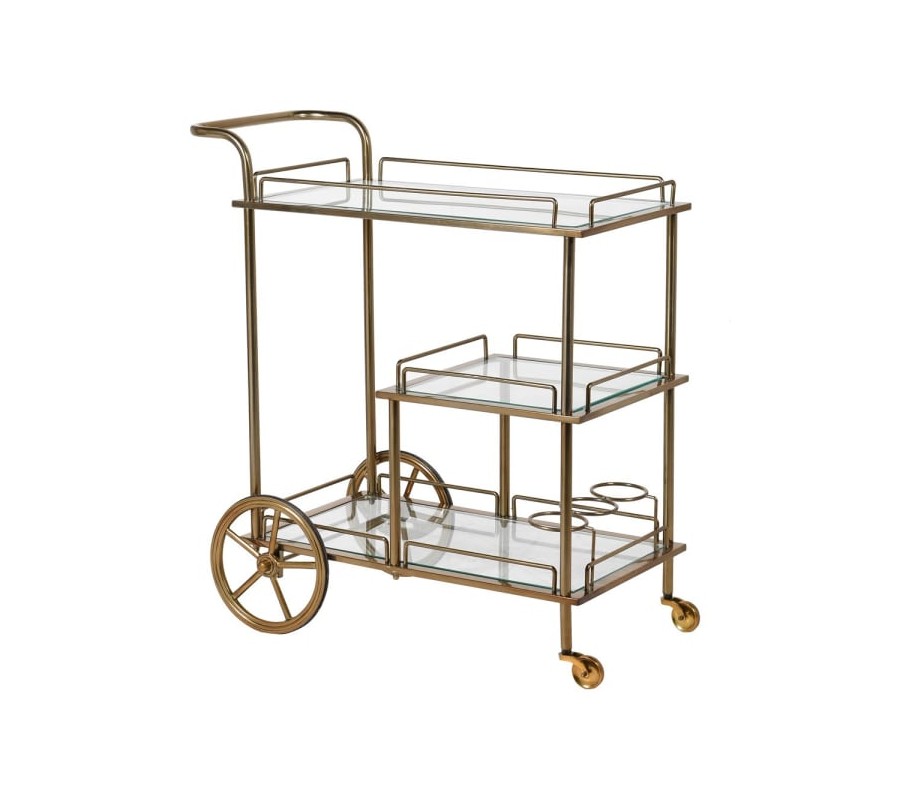Art deco mosadzný zlatý servírovací vozík Oppido z kovu na koliečkach so sklenenými poličkami 92cm