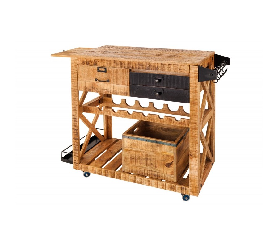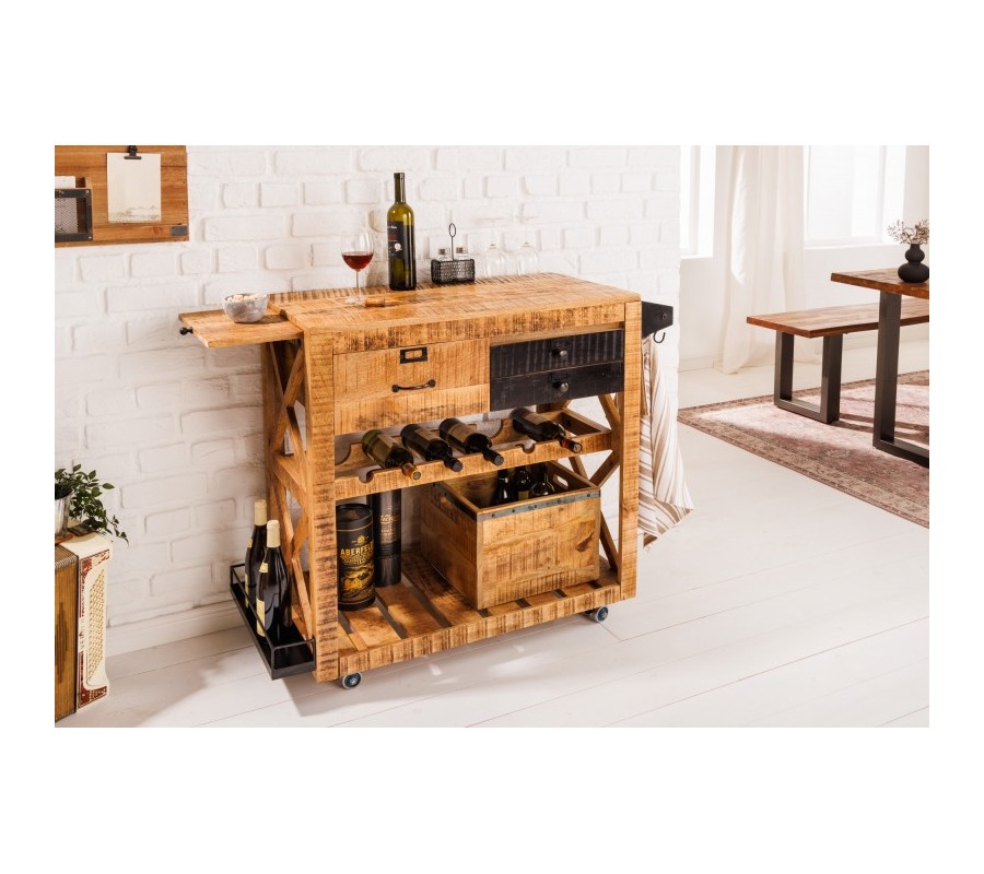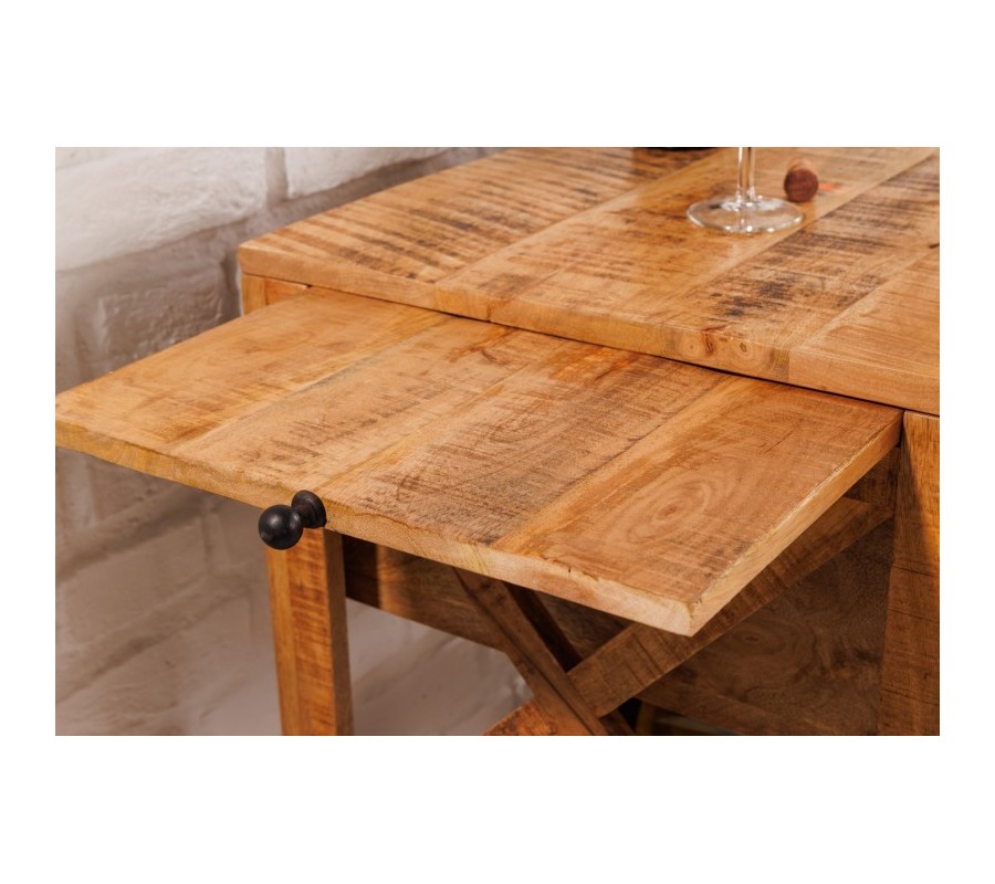 Štýlová industriálna barová skrinka Cahone z mangového masívu prírodnej hnedej farby na koliečkach 92cm