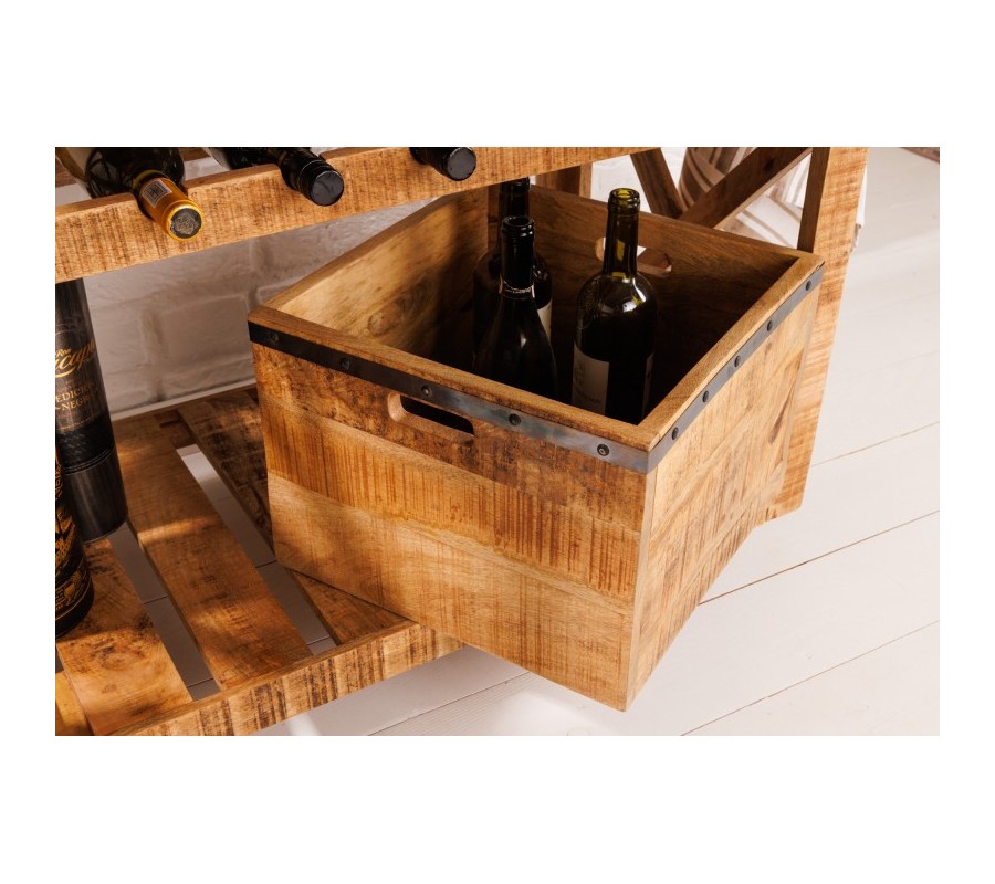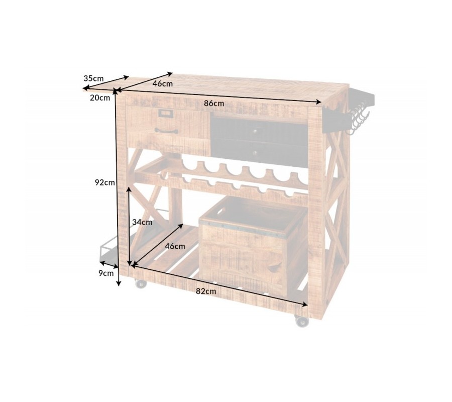 Dizajnová barová skrinka Cahone vkusne a prakticky doplní priestory moderne či industriálny ladených jedální, obývačiek či barových priestorov. Vašu miestnosť obohatí svojím naturálnym vzhľadom a zamilujú si ju všetci tí, ktorí obľubujú kvalitné a zároveň dizajnovo pútavé kúsky. Skrinka je vyrobená z masívneho mangového dreva a jej povrchová úprava sa nesie v prírodnej svetlohnedej farbe. Teplá farebnosť spríjemní vaše priestory a pomôže v nich vytvoriť skutočne útulnú atmosféru domova. K tomu tiež prispieva viditeľná kresba dreva vnášajúca do každého priestoru nezameniteľný nádych prírody. K príjemnej hnedej farbe tvorí kontrastný dojem tmavohnedé prevedenie dvoch zásuviek a čierne prvky z kovu. Skrinka disponuje praktickými zásuvkami a poličkami, pričom vrchná polička je vďaka špeciálnym výrezom ideálna na uskladnenie vínových fliaš. Po bokoch sa nachádzajú praktické háčiky vešanie, menšia polička a taktiež výsuvná pracovná doska. V spodnej časti zasa nájdete štýlovú debničku an uskladnenie ďalších fliaš. Praktické sú taktiež kolieska, ktoré výrazne uľahčujú manipuláciu. Skrinka Cahone teda prepája dizajnový vzhľad s praktickým účelom a vďaka bohatému a rôznorodému úložnému priestoru sa stane neoddeliteľnou súčasťou vašej jedálne či obývačky!