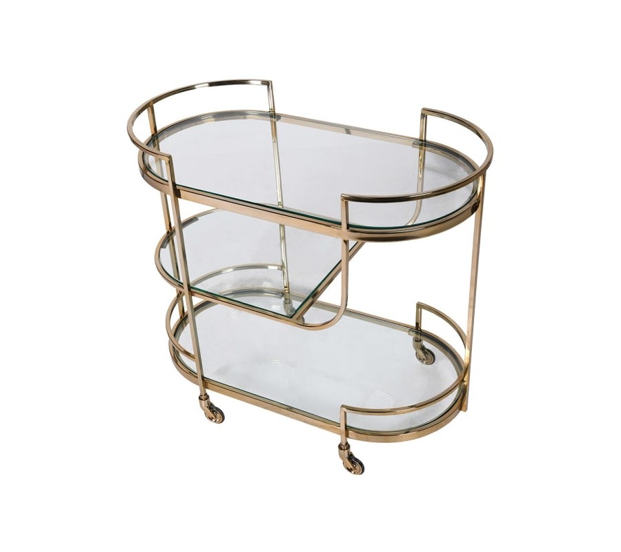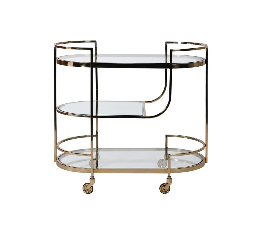 Unikátny barový vozík Monte je kúskom, ktorý si svoje miesto náde v jedánach, obývačkách i vašich súkromných barových kútikoch. Zaujme savojím elegantným glamour vzhľadom, ktorý je tvorený konštrukciou z kovu zlatej farby a tromi sklenenými poličkami. Farebná aj materiálová kombinácia je typická pre štýl art deco, a tak sa vozík bude hodiť primárne do takto ladených interiérov. Elegantný oválny tvar jednotlivých poličiek a zaoblené tvary konštrukcie zaručujú estetický vzhľad, a k praktickej funkcii prispejú zasa štyri koliečka uľahčujúce manipuláciu. Barový vozík Monte odporúčame kombinovať s ďalšími art deco kúskami z kovu či skla, rovnako sa však hodí aj k zamatovým čalúneným sedačkám či kreslám a dizajnovým doplnkom ako je napríklad stojaca lampa z kovu či nástenné zrkadlo. Obohaťte svoj priestor o tento štýlový a praktický kúsok a pozdvihnite tak servírovanie vašich obľúbených nápojov na vyššiu úroveň!