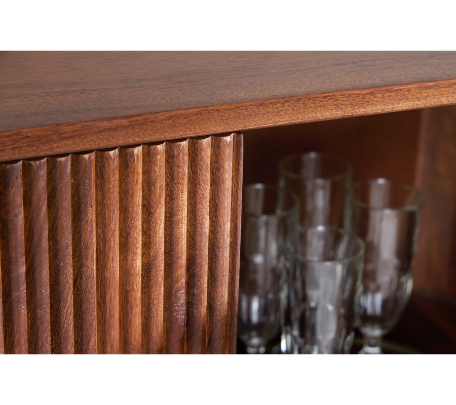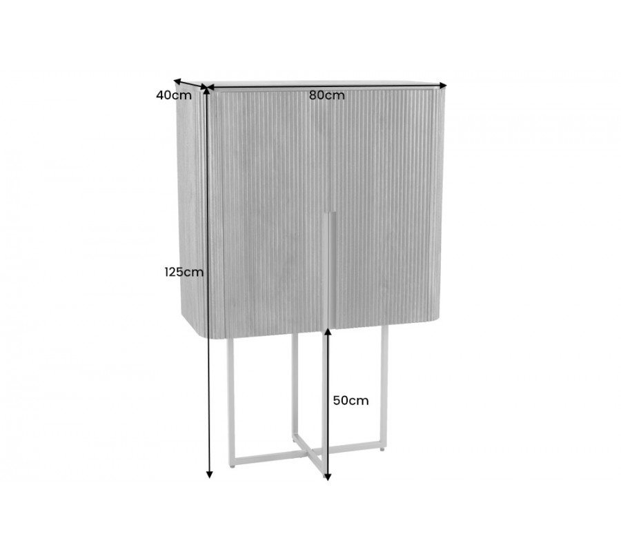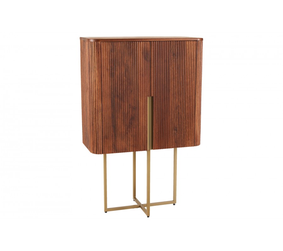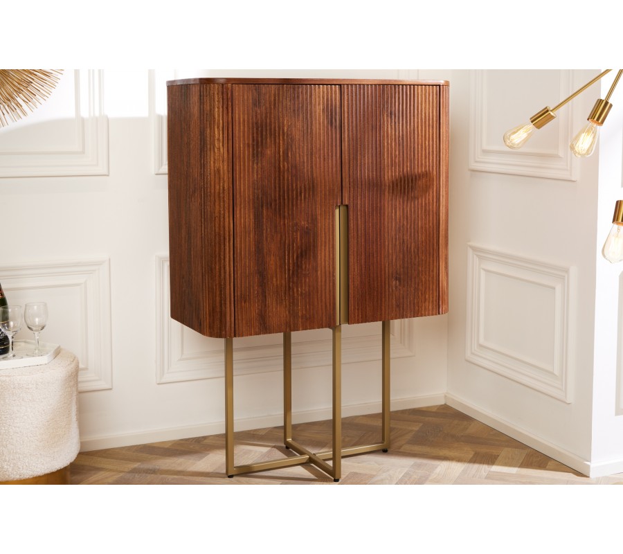Vysoká barová skrinka Gatsby na prvý pohľad zaujme drážkovaným reliéfom a nádherným masívnym mangovým drevom. Horizontálny lineárny vzor je doplnený tenkými kovovými nožičkami v zlatom prevedení. Ich umiestnenie do kríža je originálnou dizajnovou voľbou. Hlavnú úlohu hrajú geometrické tvary - výrazné zaoblené hrany dopĺňa reliéfna výzdoba tvorená oblúkmi, čo vytvára luxusný kontrast s hranatými nožičkami. Vďaka tomu je skrinka ako stvorená do jedálne či obývačky v štýle art-deco. Vašim priestorom vdýchne honosný luxus divokých 20. rokov minulého storočia, podľa ktorej ikony - Jaya Gatsbyho - je táto skrinka pomenovaná. Môžete ju doplniť ďalším nábytkom s podobnými zlatými detailmi alebo sedačkou či stoličkami so zamatovým čalúnením, ktoré neodmysliteľne patria k tejto ére. Barová skrinka vám ponúka úložný priestor predelený horizontálnou policou na dve priečky vo veľkosti 75x30x34 cm, uzatvárateľný dvomi dvierkami na pántoch s drážkovým vzorom. Skrinku môžete umiestniť aj do priestorov v retro štýle s doplnkami vo výrazných teplých odtieňoch, ako napríklad žltá, či oranžová a živými zelenými rastlinami. Pokiaľ chcete, aby vynikla jedinečnosť exotického mangového dreva, je vhodné umiestnenie do svetlých priestorov v neutrálnych farbách. Môžete ju skombinovať s TV stolíkom a príborníkom z rovnakej kolekcie.