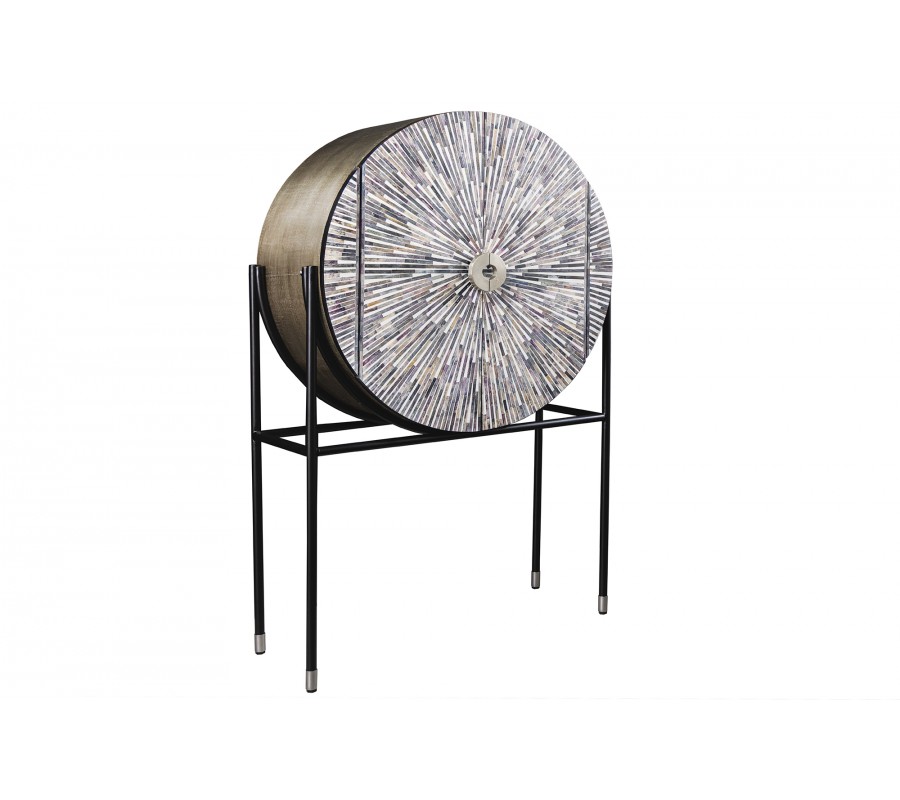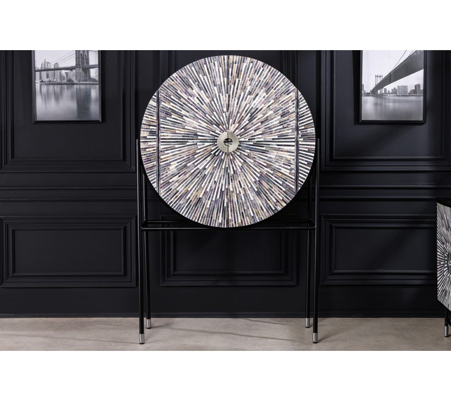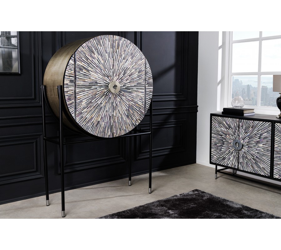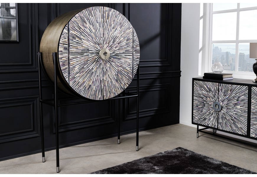 Luxusná Art-deco okrúhla barová skrinka Hueso so zrkadlom a mozaikou z byvolej kosti 160cm