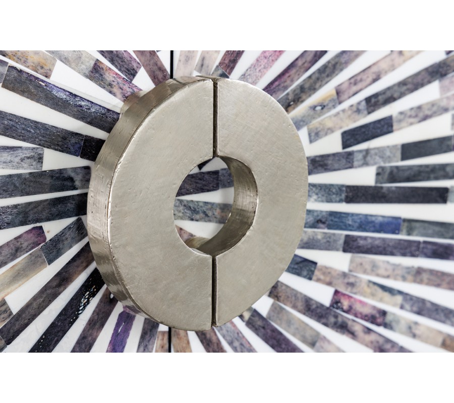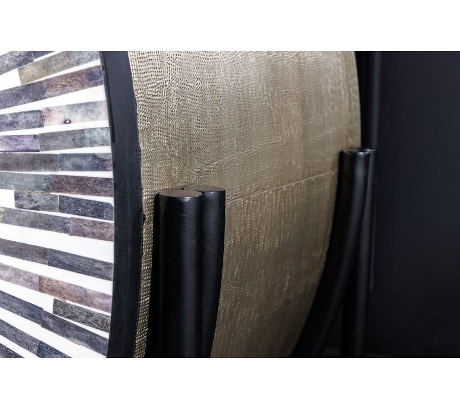 Luxusná barová skrinka zo série Hueso dokáže okúzliť každého človeka so zmyslom pre umenie. Prepracovaná mozaika z byvolích kostí, ktorá dodá každej miestnosti pocit ako z umeleckej galérie, je doplnená o atypicky okrúhly dizajn, ktorý dodáva tejto skrinke charakter. Skrinku obohacujú dvoje dvierka so striebornými kovovými rúčkami,