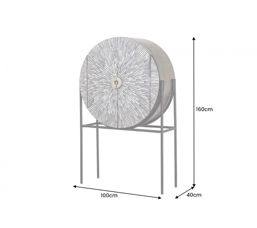 sú dizajnovane, tak že spolu s rukoväťami pripomínajú slnko a jeho lúče. Vo vnútri na vás čakajú dve sofistikovane uložené poličky, na ktoré sa dajú uložiť predmety rôzneho druhu. Po otvorení sa vám naskytne pohľad na luxusne okrúhle zrkadlo, ktoré opticky zväčšuje vnútorný priestor barovej skrinky. Okrem unikátneho dizajnu vám barová skrinka výborne poslúži na praktické účely a stane sa stredobodom pozornosti vás a vašich hostí.