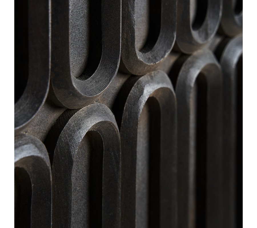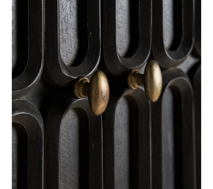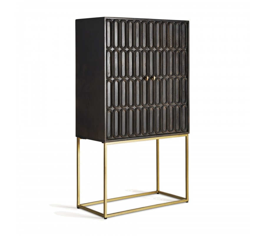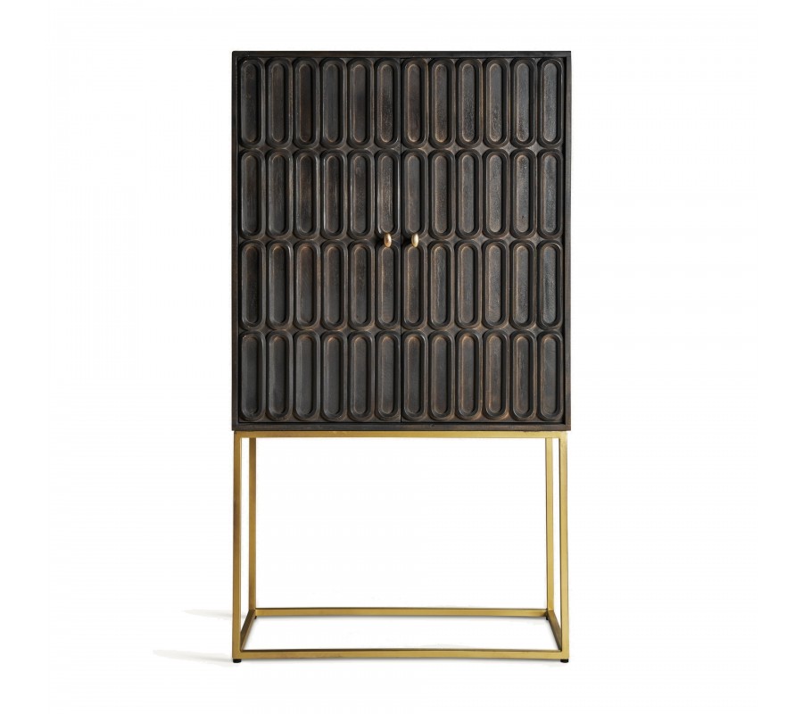 Barová skrinka Eclair bude očarujúcim doplnkom vašej jedálne či obývačky. Spája v sebe štylizovanú estetiku éry art deco s prirodzenou krásou masívneho mangového dreva. Je ručne vyrezývaná s veľkou pozornosťou k detailom a rešpektom k prirodzeným štruktúram dreva. To robí z každého kusu jedinečný a originálny remeselný výrobok. Na hladkých bočných stenách vyniká kresba letokruhov, kým predné dvierka zdobí reliéf so symetrickým štvorradovým elipsovým vzorom. S týmto motívom korešponduje aj zaoblený tvar úchytiek, ktoré sú vyrobené z kovu v zlatej farbe. Z rovnakého materiálu sú zhotovené aj štíhle nožičky spojené obdĺžnikovou konštrukciou v ich vrchnej a spodnej časti. Za dvojitými dvierkami sa nachádza bohatý úložný priestor predelený dvomi policami. Barová skrinka je funkčným nábytkom a zároveň aj výrazným vizuálnym prvkom, ktorý prinesie do vašej jedálne či obývačy honosnosť a luxus. Vďaka zlatým nožičkám ju ľahko skombinujete s art deco alebo glamour nábytkom. Hlboká tmavá čokoládová hnedá farba sa hodí do prestorov v neutrálnych farbách, kde vynikne ozdobné vyrezávanie. Dobrou voľbou je tiež kombinácia s nábytkom z masívneho dreva.