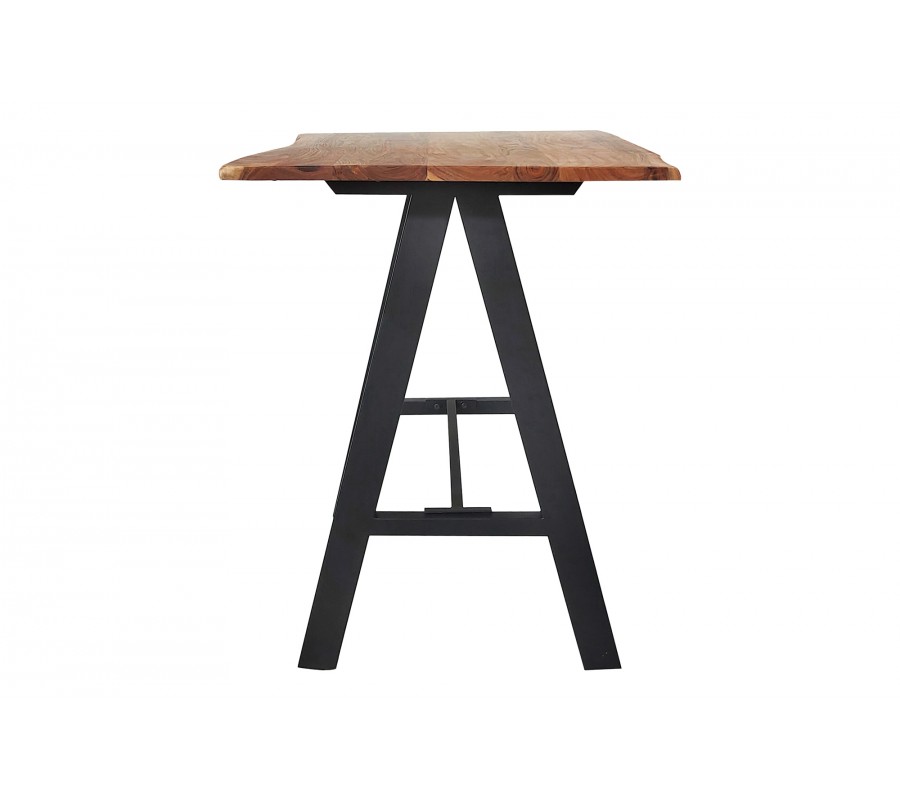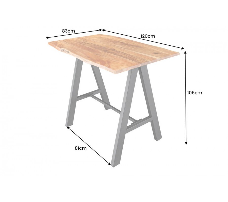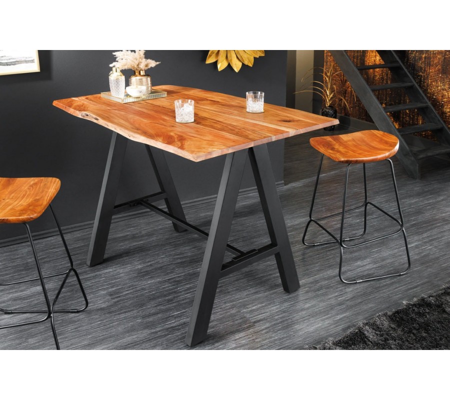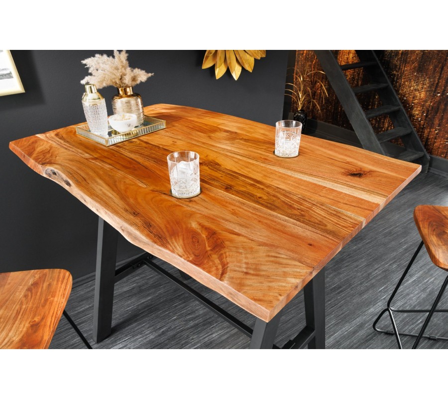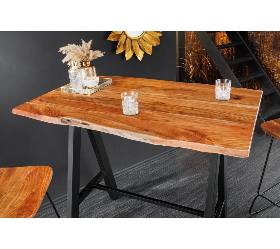 Dizajnový barový stolík Mammut vyniká svojou vrchnou doskou z lakovaného akáciového dreva v teplej prírodne hnedej farbe, ktoré dodáva autentický a neopakovateľný naturálny vzhľad. Hnedá farba akáciového dreva prináša do priestoru pocit tepla a pohody, zatiaľ čo prírodné línie a textúry na doske odrážajú prírodný vzhľad.