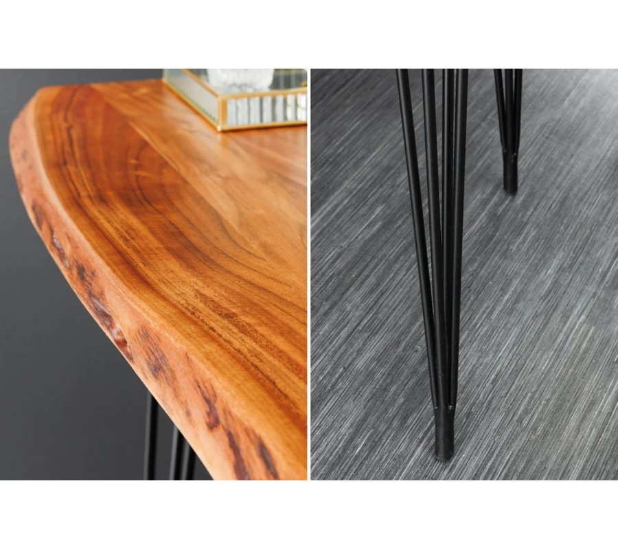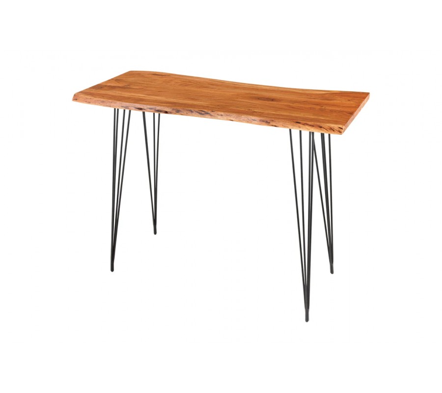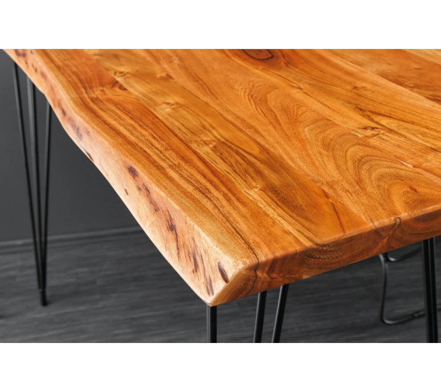 Barový stôl Mammut Vás môže zaujať svojím unikátnym a nevšedným dizajnom, ktorý spája početné úzke nožičky s masívnou vrchnou doskou. Vrchná doska disponuje vyhotovením z akáciového masívneho dreva v prírodne hnedej farbe, ktoré je obohatené o povrchové lakovanie. Vrchná doska Vás v neposlednom rade môže zaujať aj svojím teplým naturálnym vzhľadom s dôrazom na kresbu dreva, alebo zaobleným okrajom vo vlnovitom tvare.