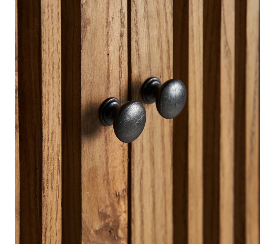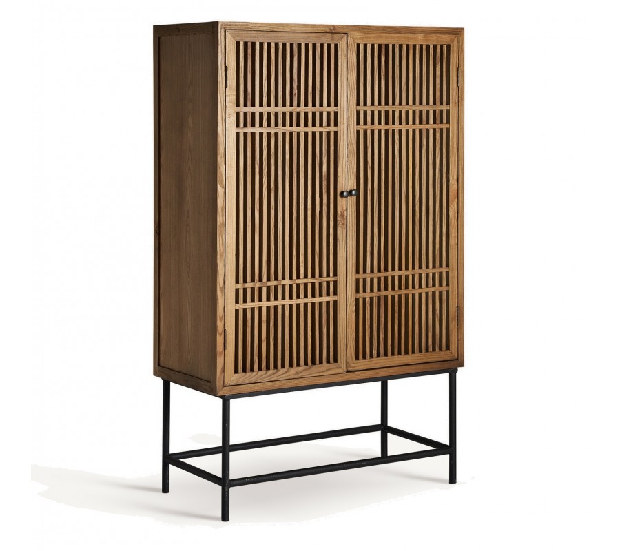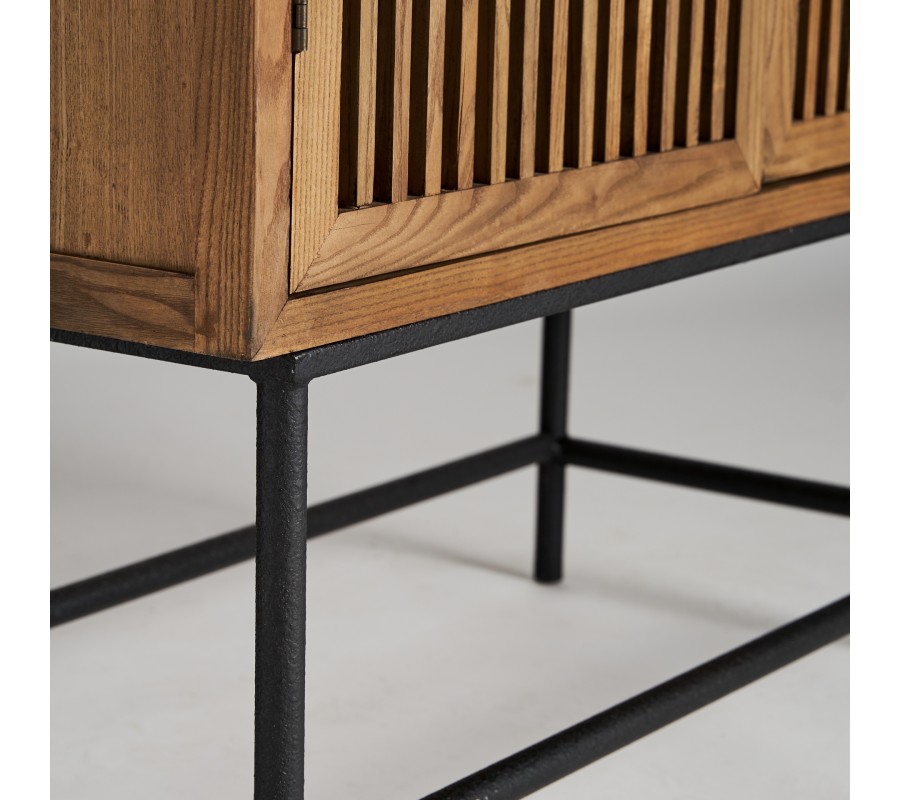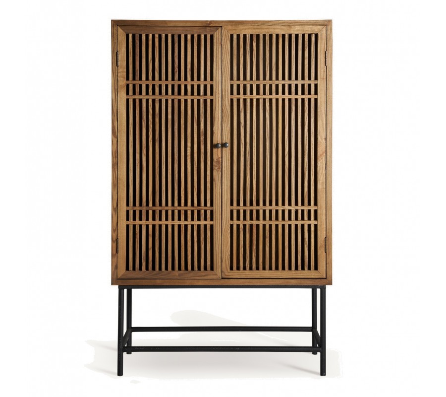 Silueta nábytku je moderná, dominujú striktné rovné línie a hladké povrchy. V tejto tendencii sa nesie aj kovová podstave v čiernej farbe, ktorú tvorí štvorica rovných nožičiek prepojených obdĺžnikovou podstavou. Najvýraznejším prvkom nábytku sú dvojité dvierka s vertikálnym mrežovaným dizajnom. Priestor medzi jednotlivými lamelami je prázdny, čo čiastočne odhaľuje interiér skrinky. Dvierka sa otvárajú pomocou hladkých okrúhlych kovových úchytiek.