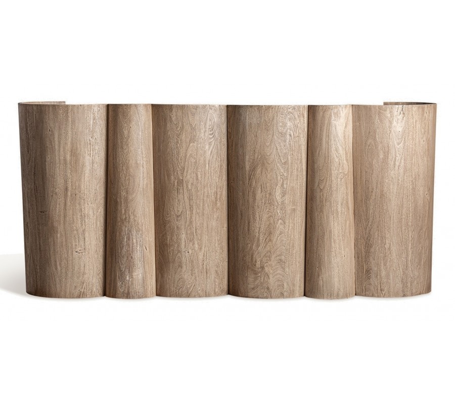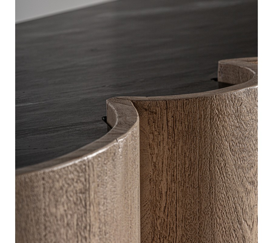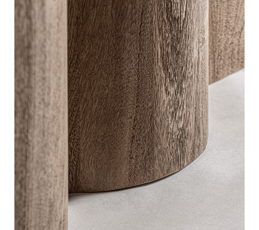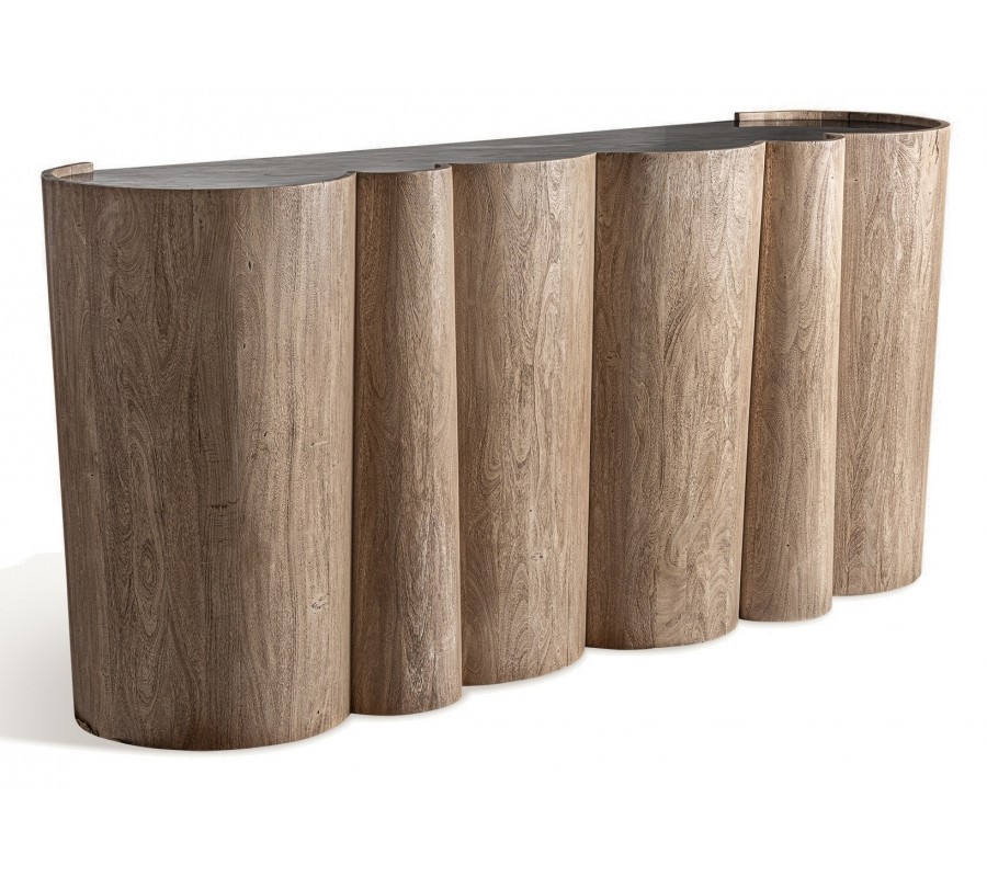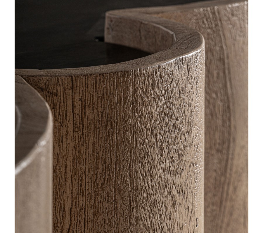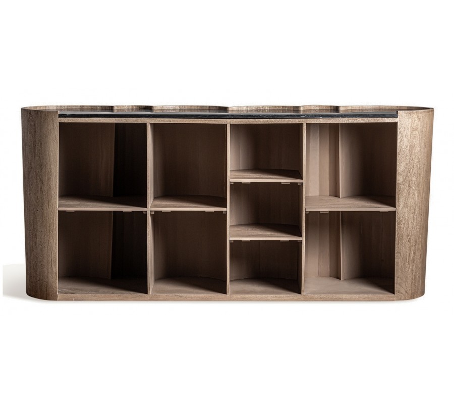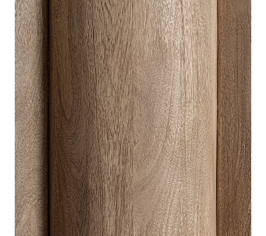 Luxusný art deco barový pult Zoran okamžite zaujme svojím sochárskym dizajnom a kombináciou exkluzívnych materiálov. Korpus z masívneho akáciového dreva má výraznú štruktúru letokruhov v prírodnej hnedej farbe. Predná strana pultu je tvorená sériou oblo tvarovaných vertikálnych valcov, ktoré vytvárajú efekt dynamickej, takmer architektonickej hmoty. Tento plastický rytmus dopĺňa vrchná oválna doska z čierneho mramoru s jemnými bielymi žilkami, ktorá dodáva celku dojem luxusu a sofistikovanosti.