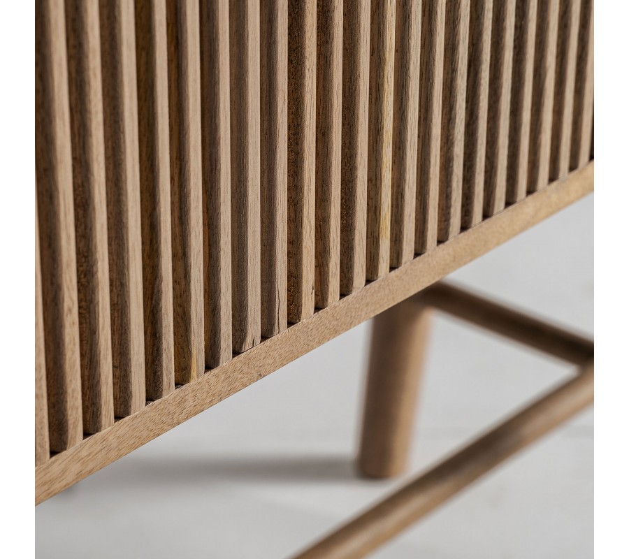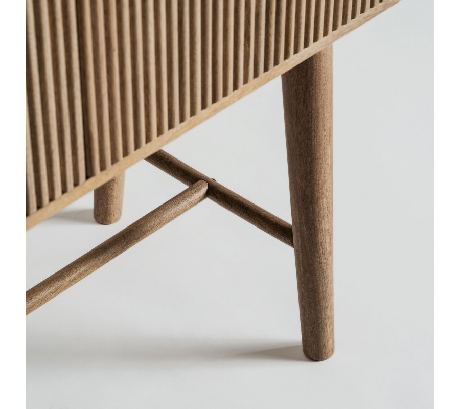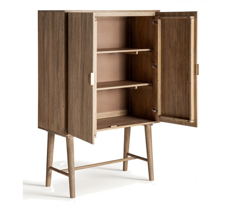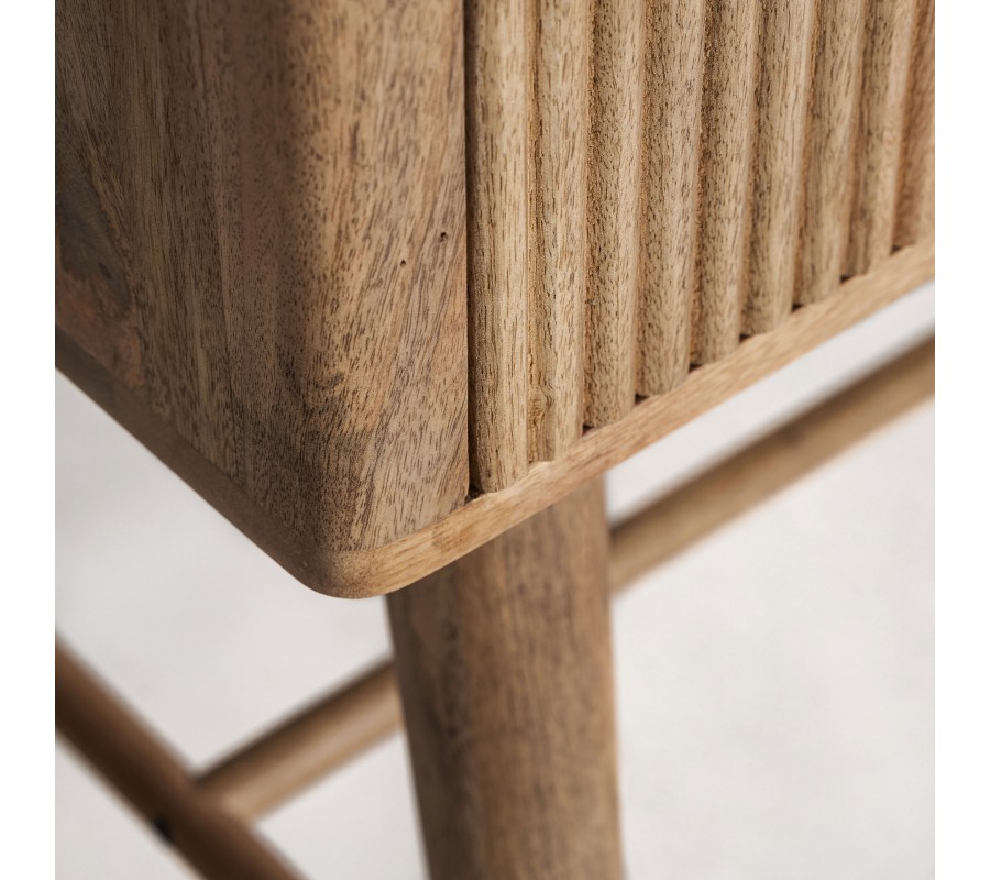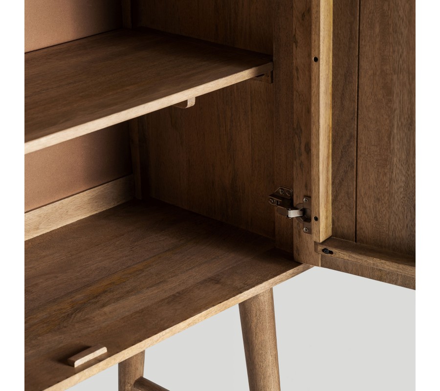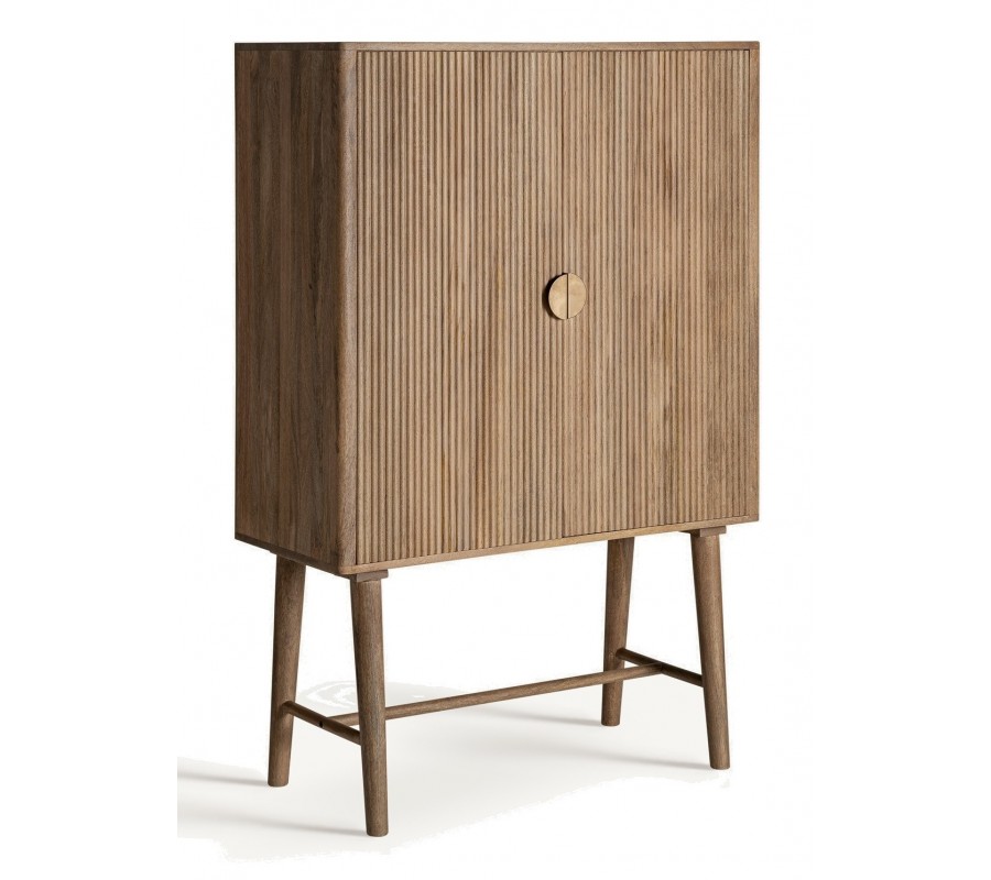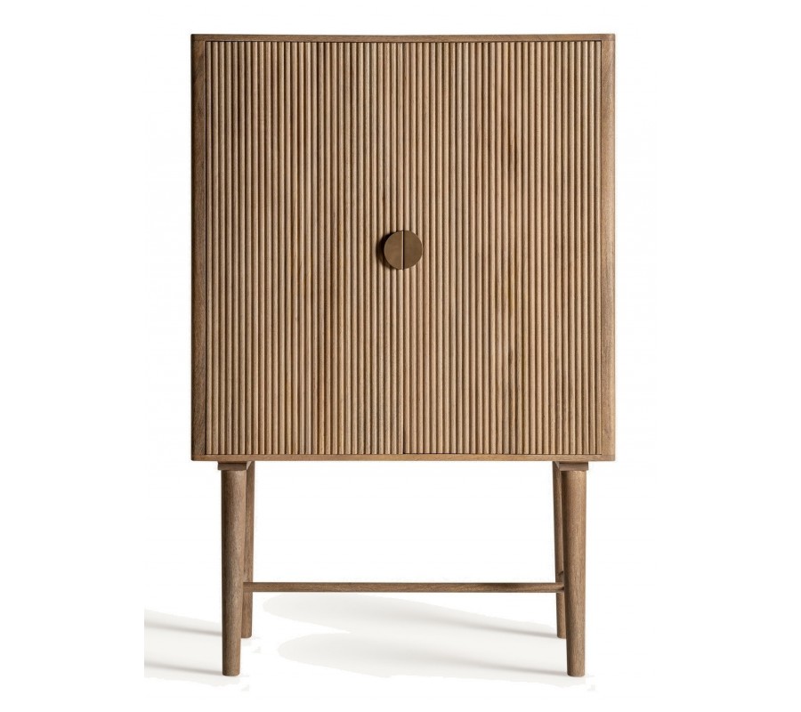 Luxusná art deco barová skrinka Neelam je elegantným a sofistikovaným kúskom, ktorý v sebe spája geometrickú precíznosť a prírodné materiály. Vyrobená z masívneho mangového dreva v hnedej farbe, vyniká výraznou vrúbkovanou štruktúrou na dvierkach, ktorá je tvorená vertikálnymi lamelami, dodávajúcimi dizajnu hĺbku a vizuálny rytmus. Dve dvierka ukrývajú praktický úložný priestor s dvomi poličkami, ideálnymi na uskladnenie skleneného riadu, fliaš alebo dekoratívnych doplnkov.