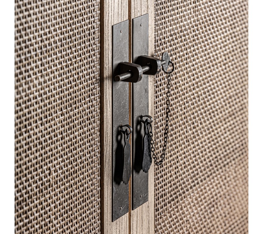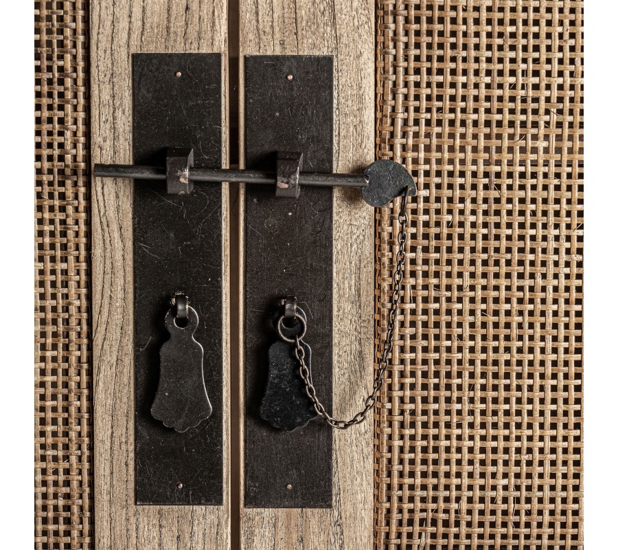 Zámok pozostáva z dvoch čiernych kovových doštičiek s otvormi, cez ktoré sa zasúva malá kovová tyč, na jednej strane uchytená retiazkou, čo vytvára vizuálne zaujímavý a zároveň funkčný detail. Tento prvok pripomína tradičné koloniálne uzávery a dodáva skrinke charakter.