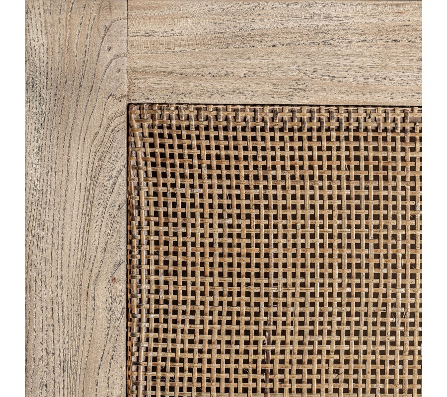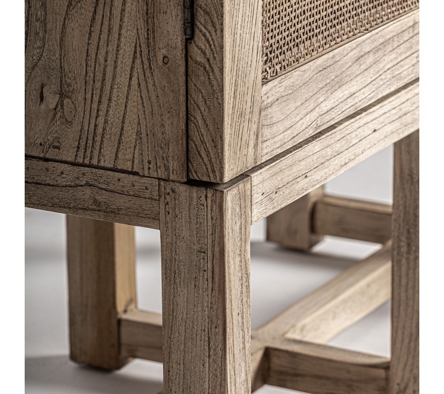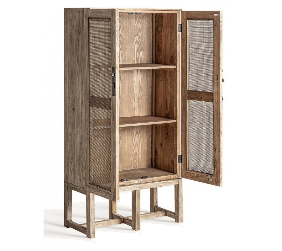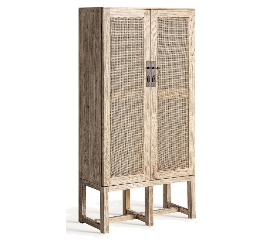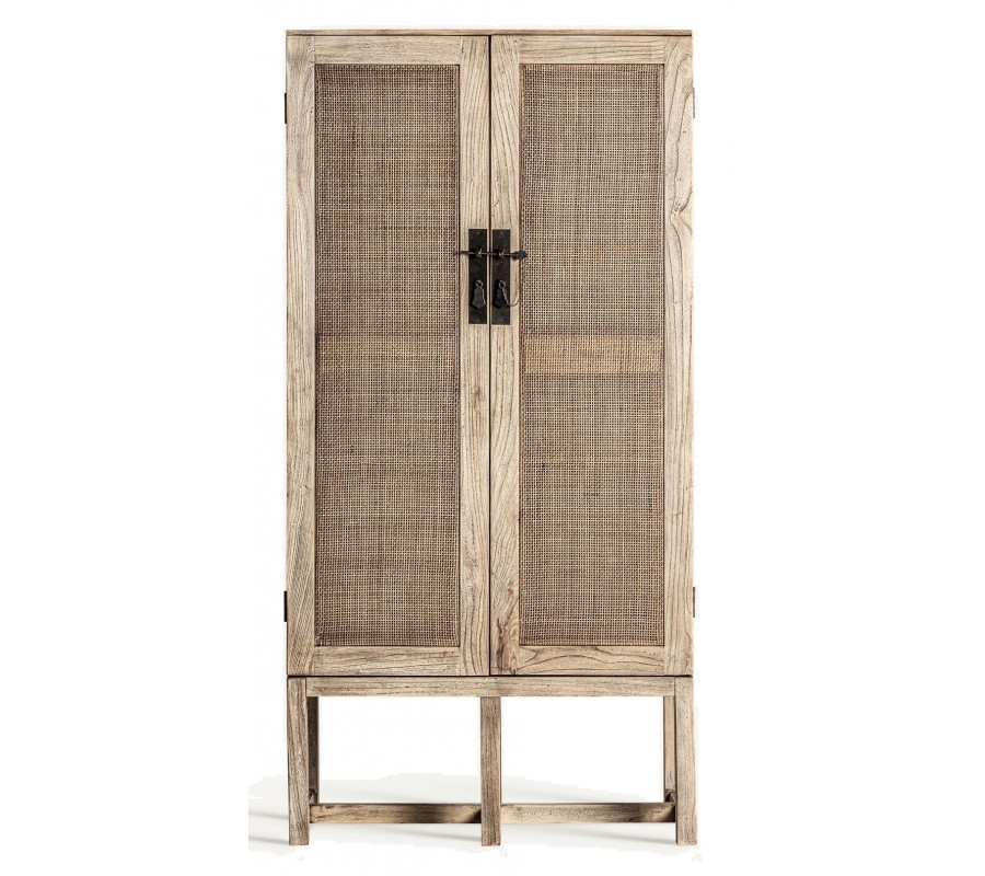 Luxusná barová skrinka Ruka zaujme čistým obdĺžnikovým tvarom a remeselne spracovaným masívnym brestovým drevom so svetlým, prirodzene hnedým odtieňom. Dvierka sú dekorované prúteným viedenským výpletom v koloniálnom štýle, ktorý dopĺňa elegantná a originálna kovová mechanika uzatvárania. Skriňa disponuje dvomi policami.