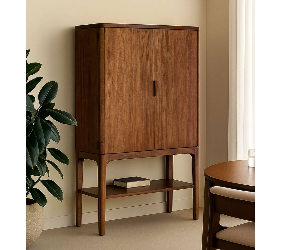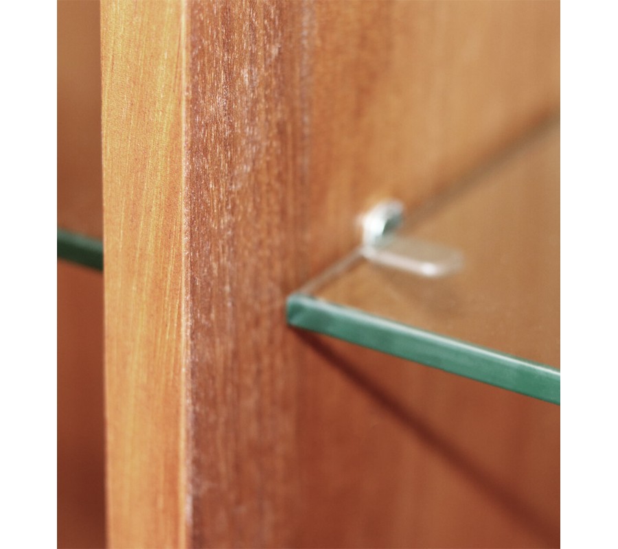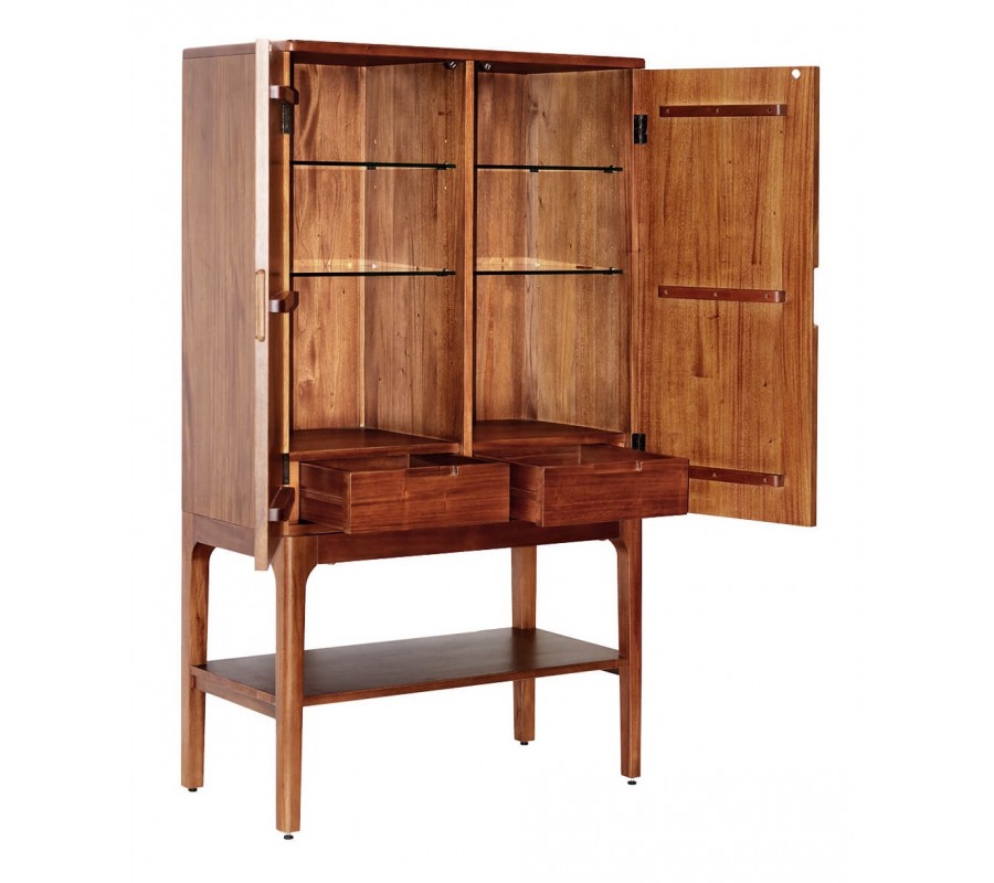 Interiér skrinky je v strede predelený vertikálnou priečkou. V každej sekcii sa nachádzajú dve police z bezpečnostného skla, vhodné na uloženie pohárov či riadu. V spodnej časti je vyšší odkladací priestor, ideálny na fľaše. Pod ním sa nachádzajú dodatočné dve zásuvky, ktoré môžete využiť napríklad na príbory či barové náradie.