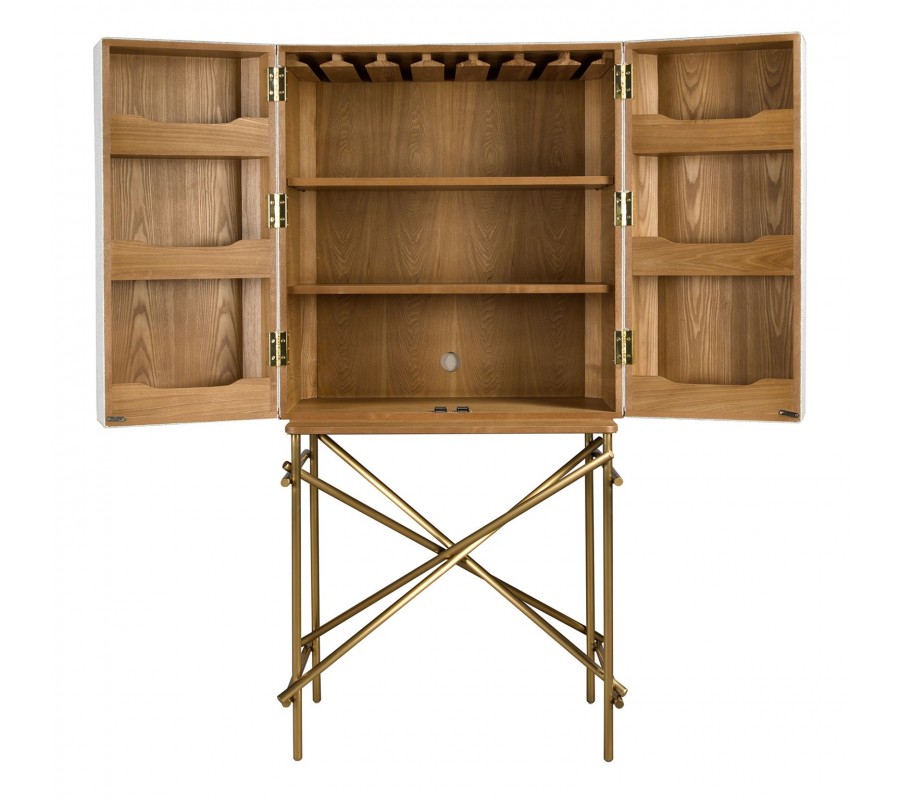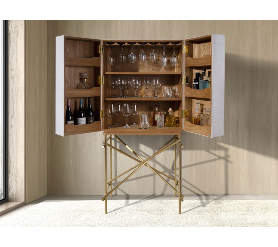 Barová skrinka má telo vyrobené z kvalitného dyhovaného orechového dreva. Má obdĺžnikový pôdorys s jemne zaoblenými vertikálnymi hranami, ktorý v kombinácii s geometrickou podstavou dodáva nábytku dotyk art deco estetiky. Podstava je vyrobená z kovu v zlatej farbe a tvorí ju štvorica štíhlych nožičiek, spevnená diagonálne umiestnenými výstuhami. Tento prvok pripomína svojím tvarom motýlie krídla a okrem výbornej stability dodáva nábytku aj štýlový dekoratívny element, korešpondujúci s moderným vizuálom.