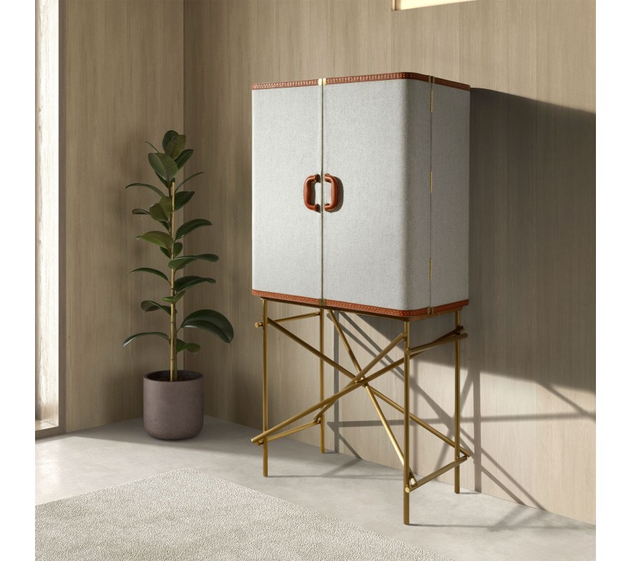 Drevené časti pokrýva z vonkajšej strany elegantný textilný poťah v oblačnej sivej farbe. Hornú a spodnú stranu lemujú dekoratívne pruhy z pravej kože v koňakovom hnedom odtieni. Z rovnakého materiálu sú vyrobené aj výrazné poloblúkové úchytky dvojitých dvierok. Tieto kožené detaily pripomínajú dizajn starožitných cestovných kufrov a prinášajú ľahký vintage nádych.