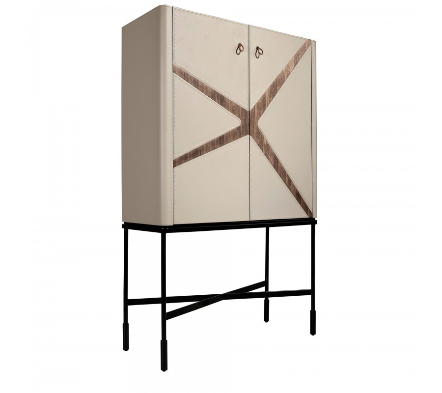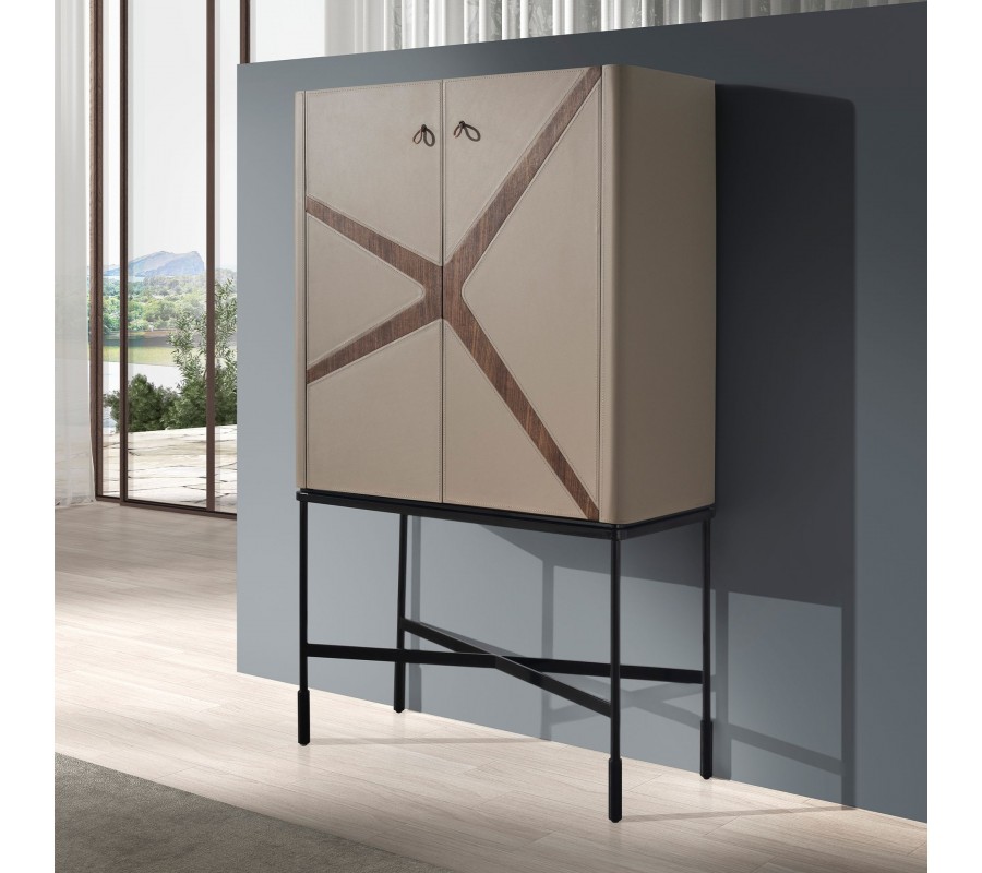 Luxusná moderná barová skrinka Forma Moderna s béžovým poťahom z pravej kože a hnedými drevenými detailmi 150 cm