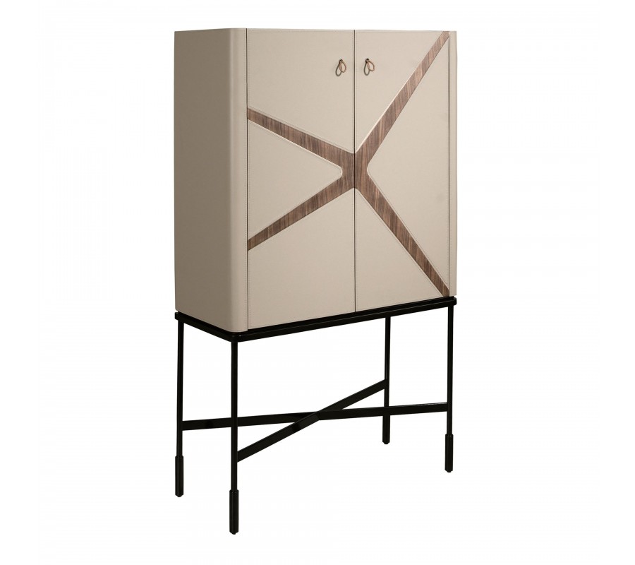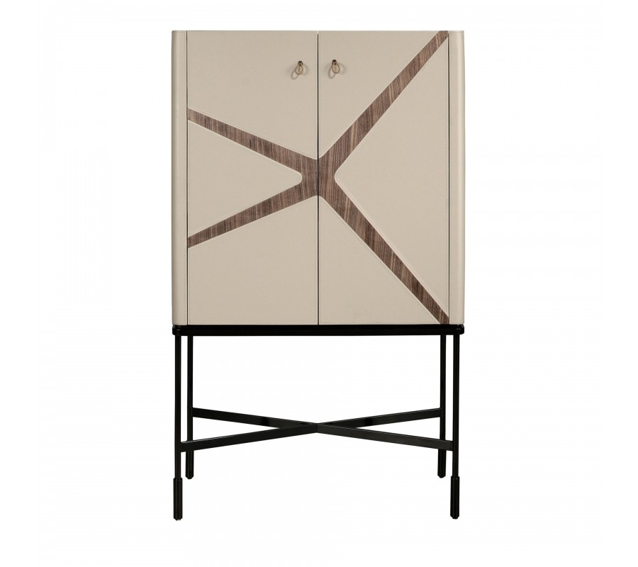 Telo skrinky má obdĺžnikový pôdorys a je vyrobené z pravej orechovej dyhy s naturálnej teplej hnedej farbe. Jemná kresba letokruhov vytvára subtílnu vizuálnu štruktúru a zároveň prináša do kompozície prírodné teplo. Bočné strany sú pokryté poťahom z pravej kože v norkovej béžovej farbe. Na dvierkach je v poťahu výrez v tvare asymetrického X, ktorý odhaľuje drevo pod poťahom. Toto zdobenie pôsobí moderným dojmom a dodá priestoru minimalistický dekoratívny prvok.