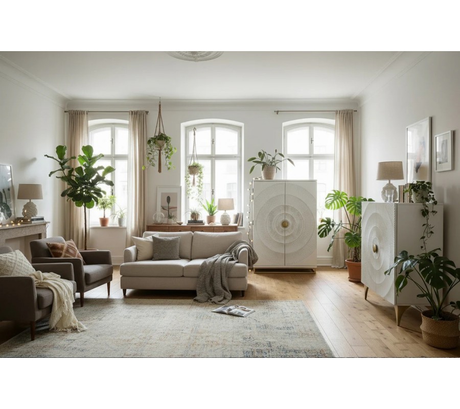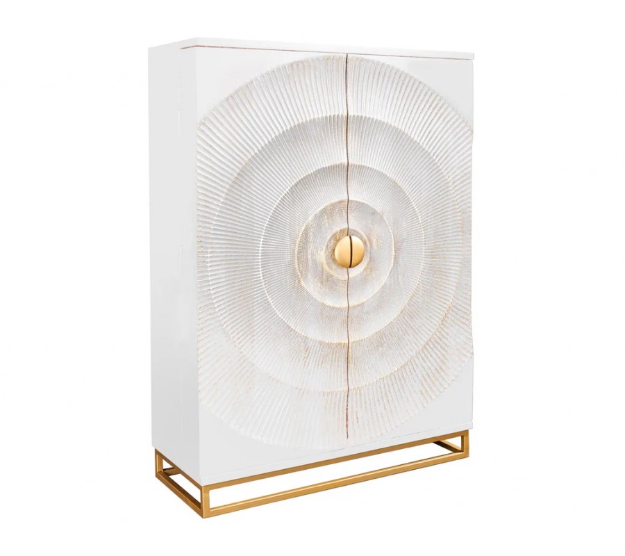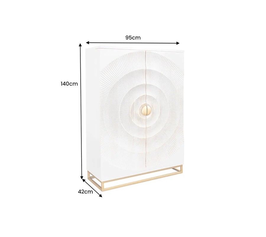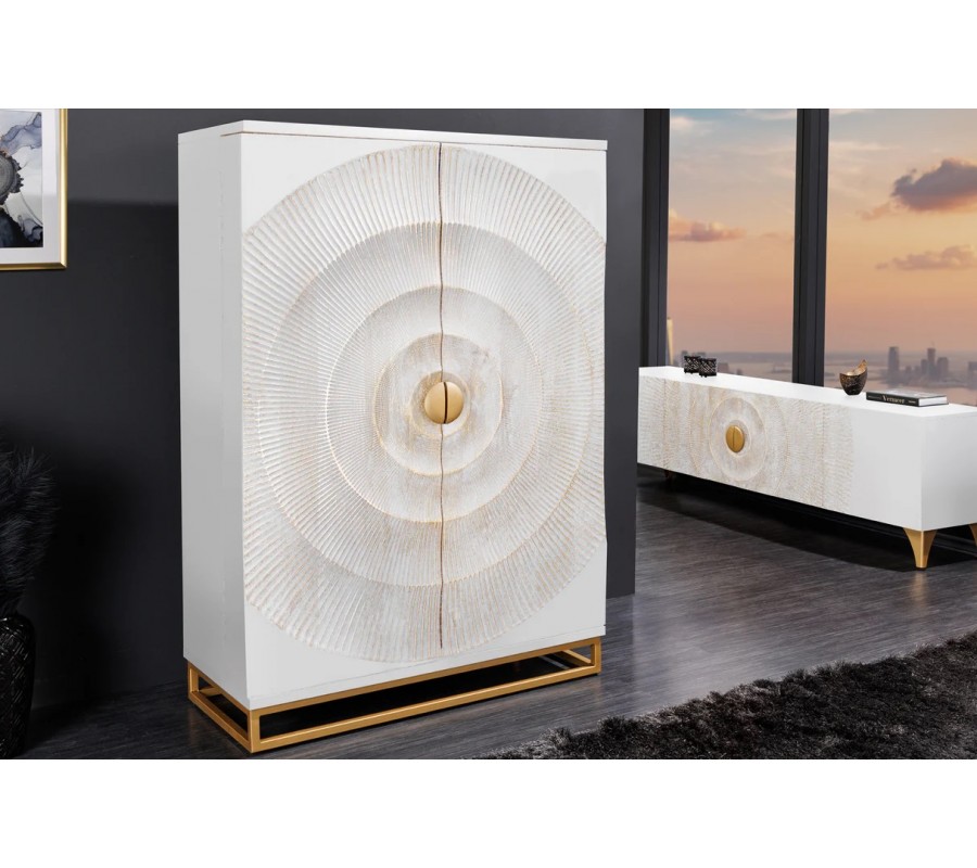 Luxusná orientálna dvojdverová barová skrinka Cumbria je výrazný dizajnový solitér, ktorý v interiéri okamžite upúta pozornosť a dodá mu exkluzívny charakter. Skriňa je vyrobená z masívneho mangového dreva v elegantnej bielej farbe, doplnenej o zlaté detaily, ktoré podčiarkujú jej luxusný a dekoratívny vzhľad. Dominantným prvkom sú dvoje dvere s bohatým reliéfnym zdobením – nachádzajú sa na nich štyri kružnicové vyrezávané motívy so zlatou patinou, ktoré pôsobia plasticky a umelecky. V strede dverí sú umiestnené polkruhové zlaté kovové úchytky, ktoré po zatvorení vytvárajú jeden celistvý kruh a dotvárajú symetrický dizajn skrine. Interiér je v hnedej prírodnej farbe.