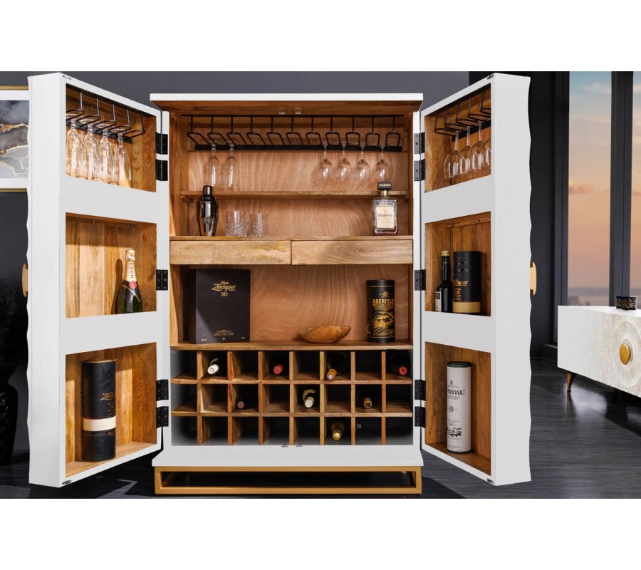 Luxusná orientálna dvojdverová biela barová skrinka Cumbria z masívneho dreva so zlatými detailmi a kovovou konštrukciou 140 cm