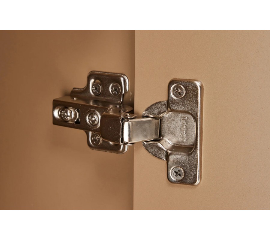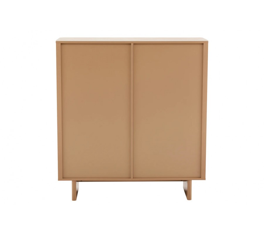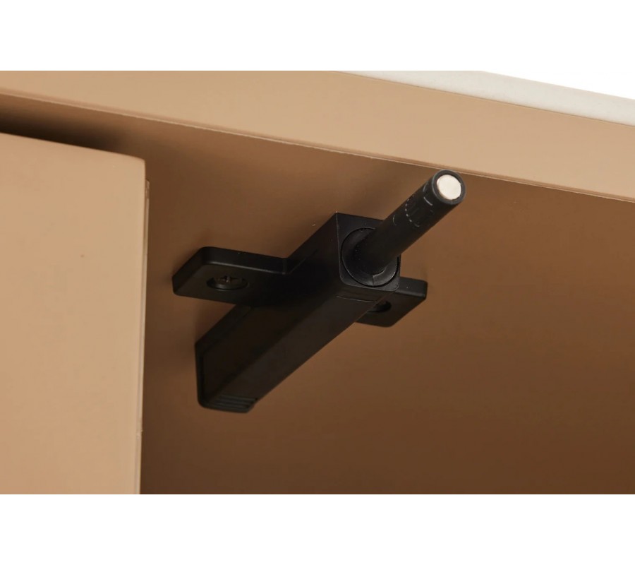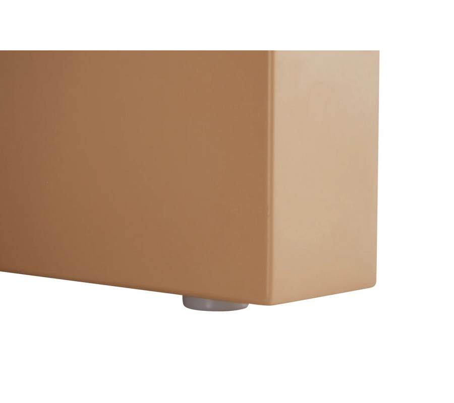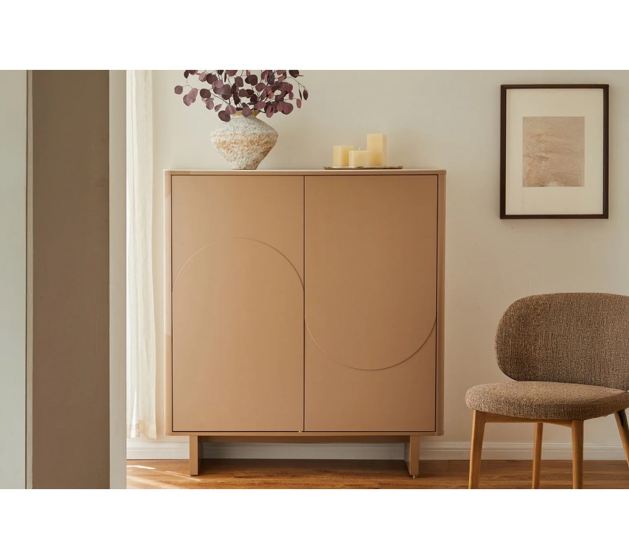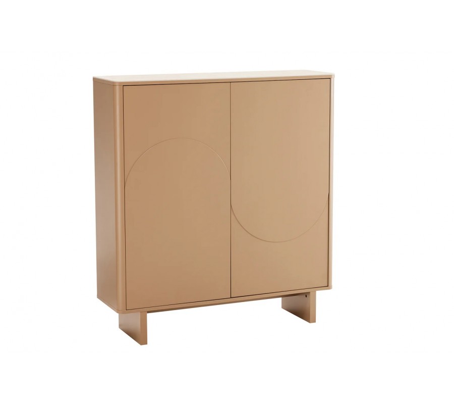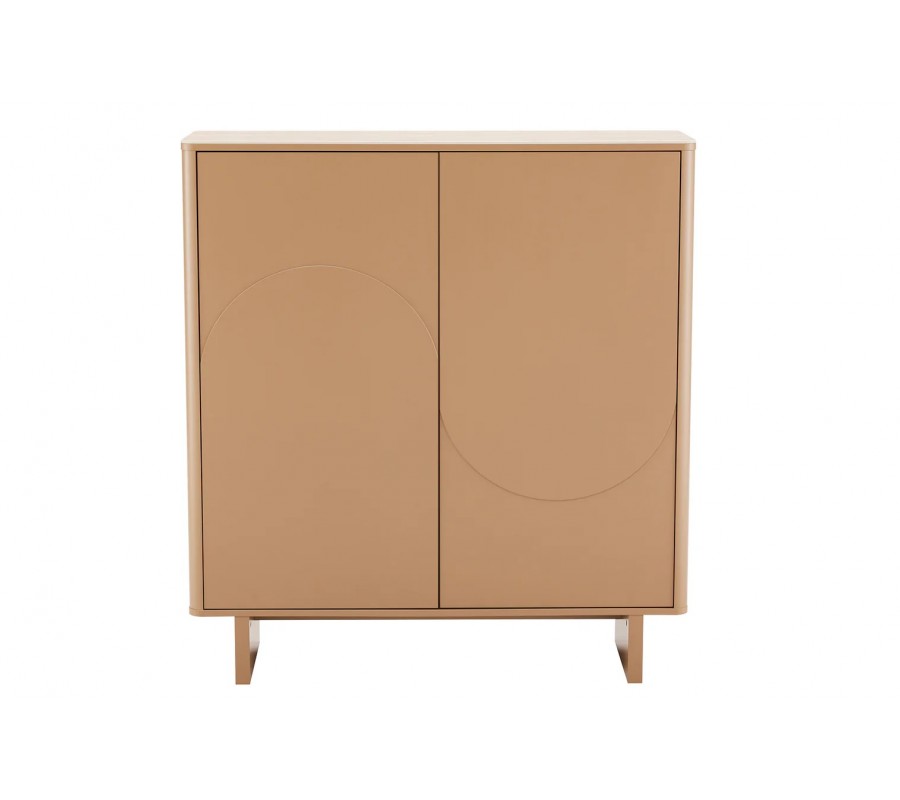 Skrinka je vyrobená z dyhovaného dreva s teplým svetlohnedým lakovaním. Výborne ho dopĺňa vrchná doska z keramiky s dizajnom prírodného travertínu v béžových odtieňoch, ktorá tiež zaručuje pevný, odolný a na údržbu nenáročný povrch. Dvierka zdobí geometrický reliéf z dvoch poloblúkov, ktoré sa spájajú do dizajnu vlny. Tvar je výrazný a typický pre art deco štýl, no prevedenie zo znížených a zvýšených plôch pôsobí moderným minimalistickým dojmom.