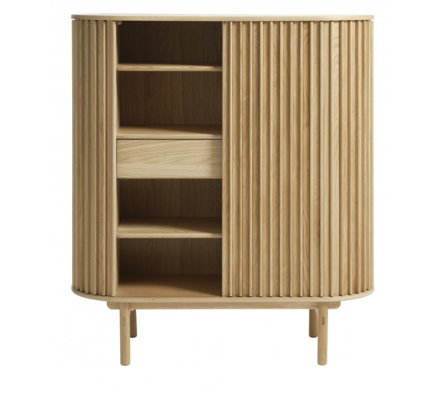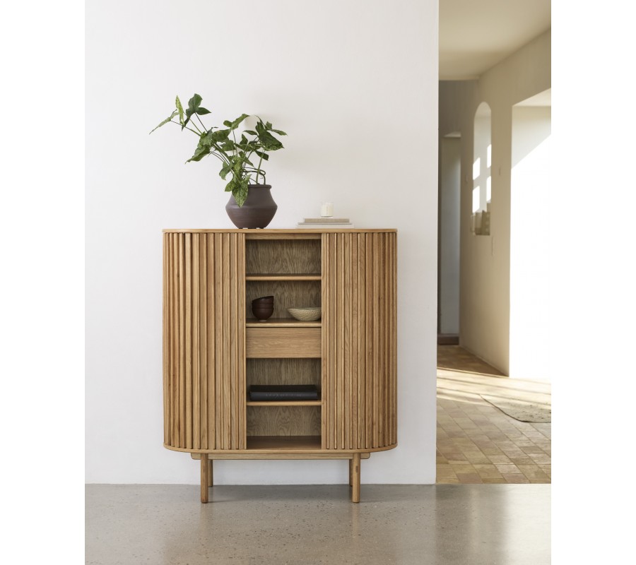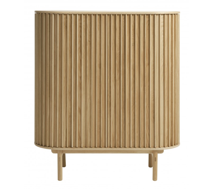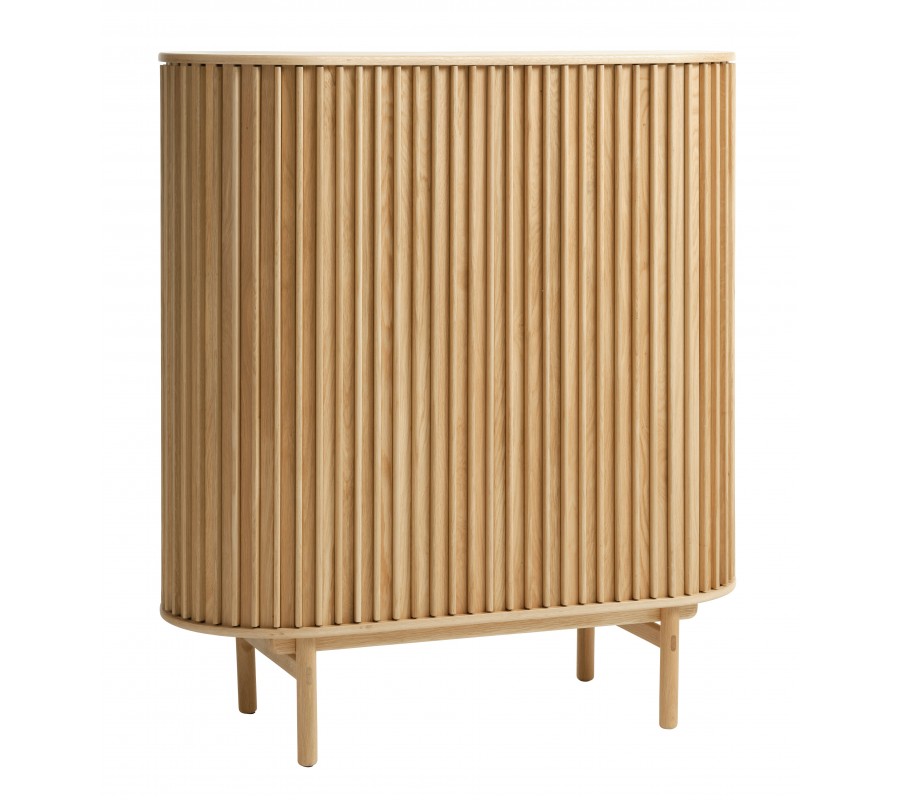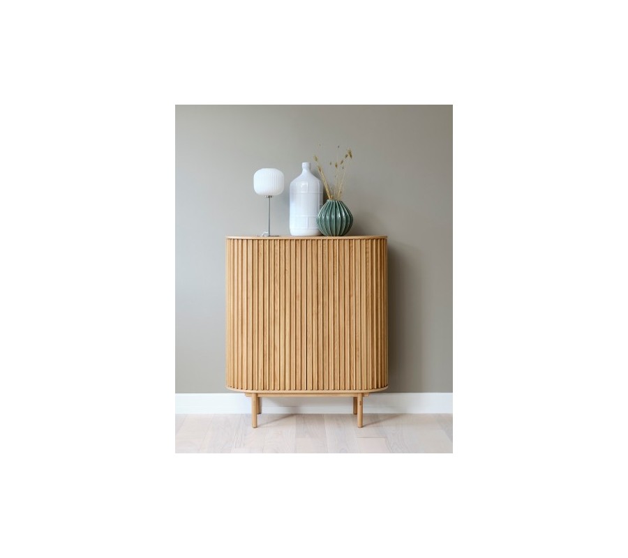 Barová skrinka Roskilde predstavuje harmonické spojenie škandinávskeho minimalizmu a retro estetiky. Vyrobená je z kvalitnej pravej dubovej dyhy v teplom hnedom odtieni, ktorý zvýrazňuje prirodzenú kresbu letokruhov a dodáva interiéru útulný, nadčasový charakter. Jej oválny tvar zjemňuje celkový vzhľad a pôsobí elegantne aj originálne.