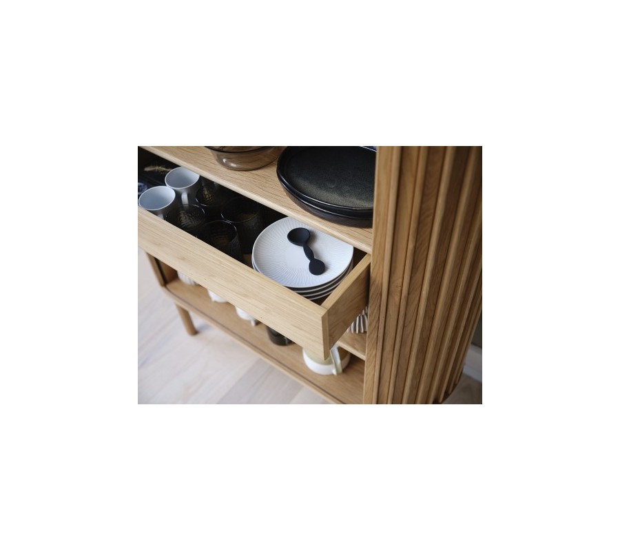 Vnútorné usporiadanie ponúka štyri police a jednu zásuvku, ktoré poskytujú dostatok miesta na uloženie fliaš, pohárov, riadu či ďalších doplnkov. Vďaka tomuto riešeniu bude všetko prehľadne usporiadané a zároveň elegantne ukryté. Celok dopĺňajú štíhle drevené nožičky, ktoré skrinku opticky odľahčujú a podčiarkujú jej škandinávsky charakter.