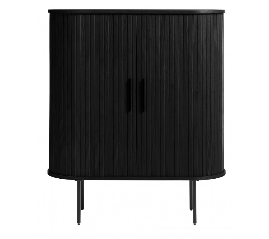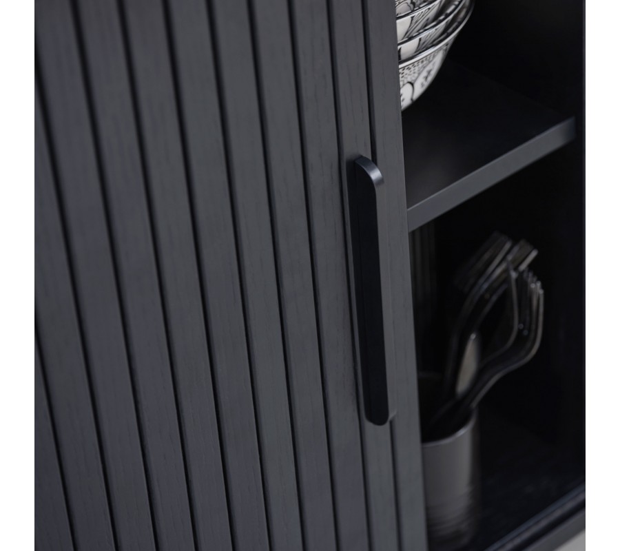 Skrinka má jednoduché valcovité nožičky, ukončené klzákmi na ochranu podlahy. Ich štíhly tvar nábytok vizuálne odľahčuje a čierne kovové prevedenie pôsobí jemne industriálnym dojmom. V rovnakom vyhotovení sú vyrobené aj úchytky dvierok. Majú vertikálny tvar, ktorý výborne zapadá do lamelového dizajnu a zaoblené tvary, korešpondujúce s celkovou siluetou nábytku.