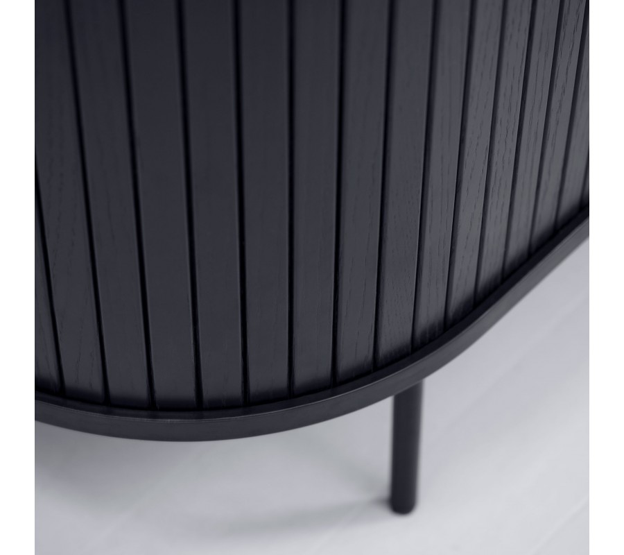 Retro oválna čierna barová skrinka Bornholm dvomi posuvnými lamelovými dvierkami a kovovými detailmi 118 cm