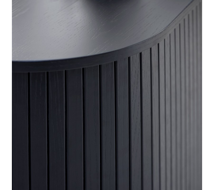 Barová skrinka má oválny tvar s hladkou vrchnou doskou. Dominantným prvkom je vertikálne lamelové zdobenie po jej obvode, ktoré prináša do dizajnu minimalistický dekoratívny prvok. Tento vizuál podčiarkujú aj nenápadne integrované posuvné dvierka, dodávajúce skrinke retro nádych.